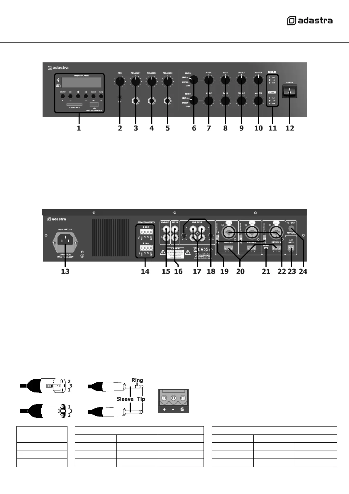 (3, 4, 5) or via XLR, 6.3mm jack or screw terminal at the rear (20, 22), offering comprehensive input options.