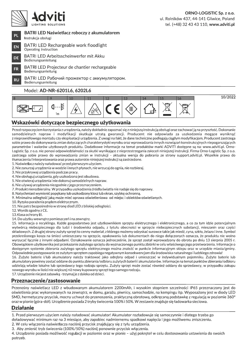 Olvassa el alább 📖 a magyar nyelvű használati útmutatót Adviti AD-NR-6202L6 (7 oldal) a Lampa kategóriában. Ezt az útmutatót 12 ember találta hasznosnak és 6.5 felhasználó értékelte átlagosan 4.4 csillagra