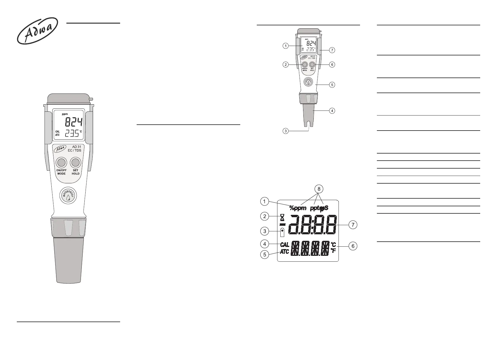 (ppm & μS for AD31, ppt & mS for AD32)