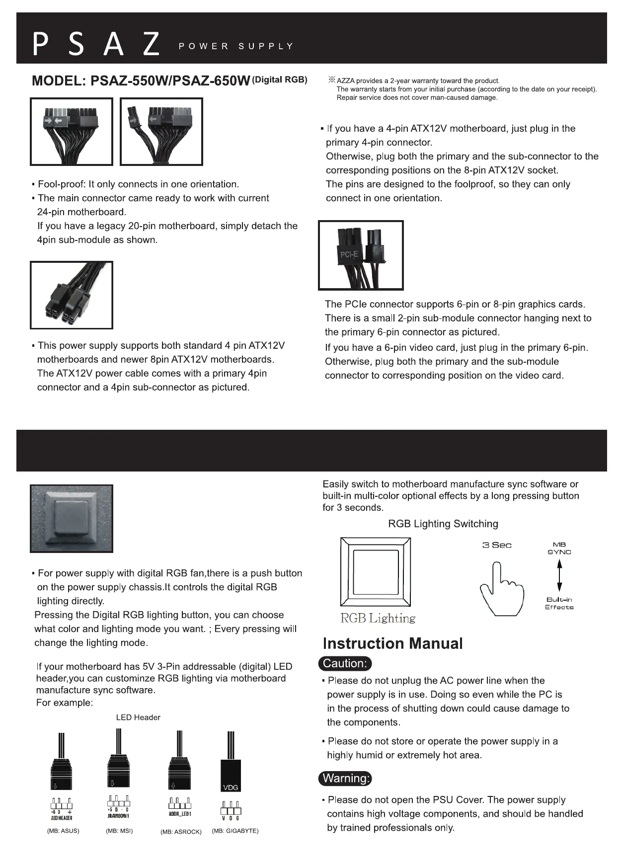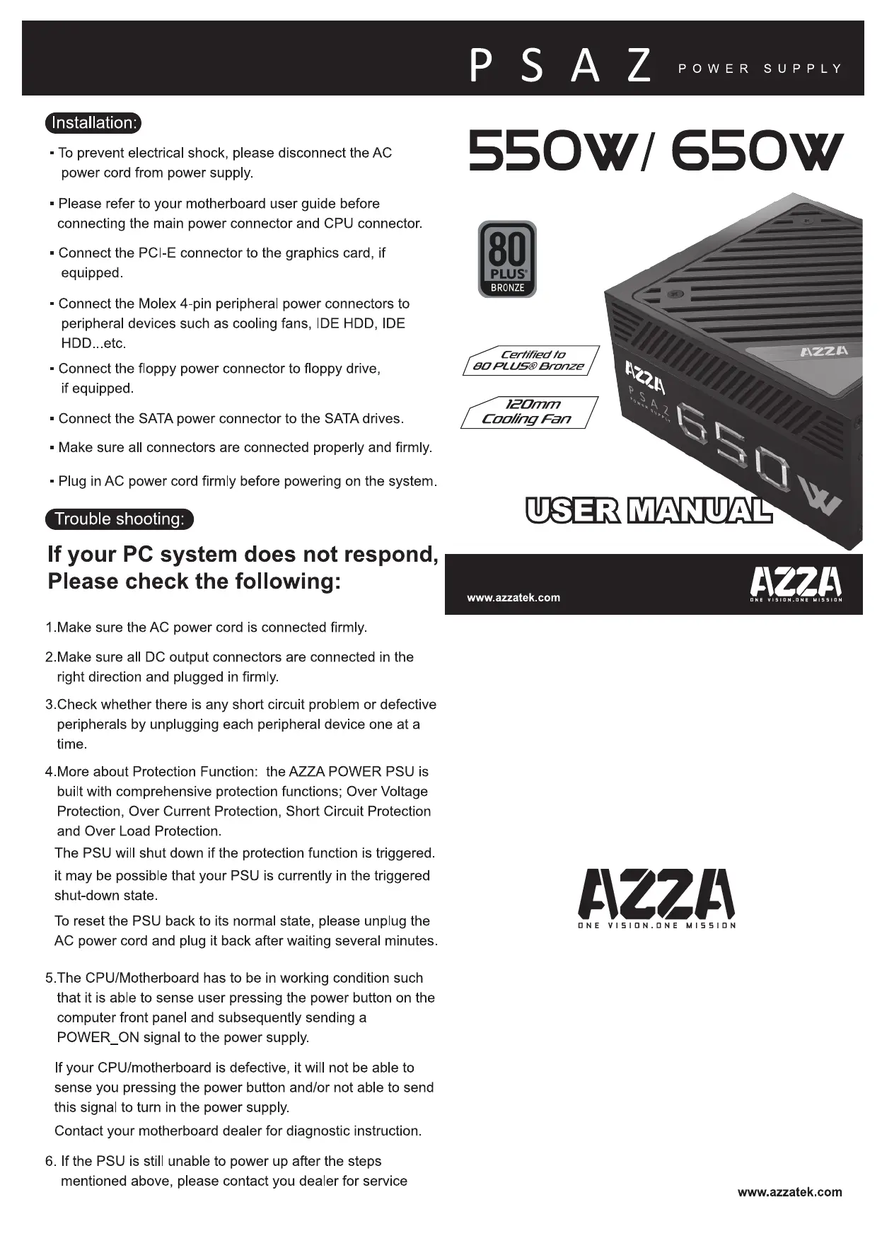 Olvassa el alább 📖 a magyar nyelvű használati útmutatót AZZA PSAZ New 650W (2 oldal) a Számítógép tápegység kategóriában. Ezt az útmutatót 15 ember találta hasznosnak és 8 felhasználó értékelte átlagosan 4.9 csillagra