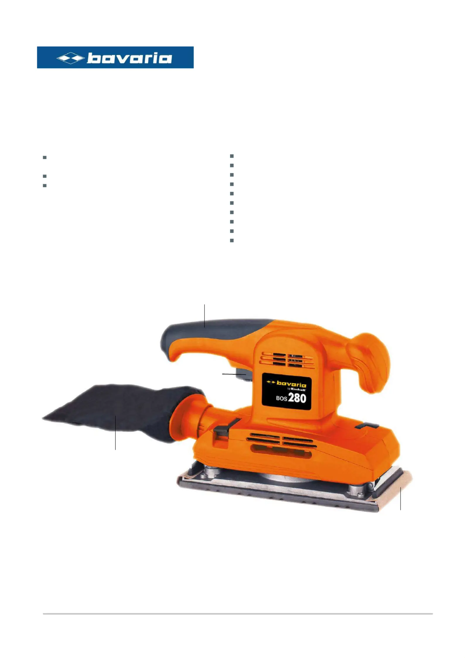 Olvassa el alább 📖 a magyar nyelvű használati útmutatót Bavaria By Einhell BOS 280 (1 oldal) a Sander kategóriában. Ezt az útmutatót 16 ember találta hasznosnak és 8.5 felhasználó értékelte átlagosan 4.7 csillagra