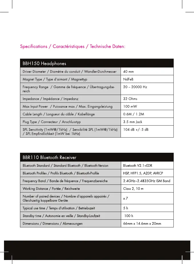 Olvassa el alább 📖 a magyar nyelvű használati útmutatót BeeWi BBH150 (20 oldal) a fejhallgató kategóriában. Ezt az útmutatót 11 ember találta hasznosnak és 6 felhasználó értékelte átlagosan 4.3 csillagra