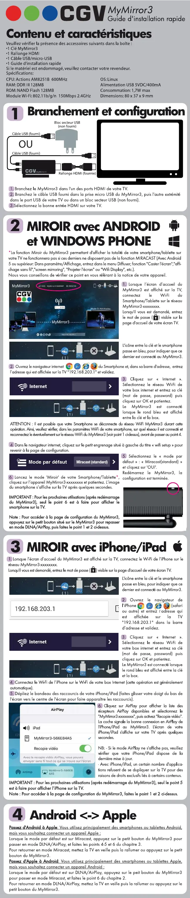 Olvassa el alább 📖 a magyar nyelvű használati útmutatót CGV My Mirror 3 (4 oldal) a Dongle kategóriában. Ezt az útmutatót 20 ember találta hasznosnak és 10.5 felhasználó értékelte átlagosan 5.0 csillagra