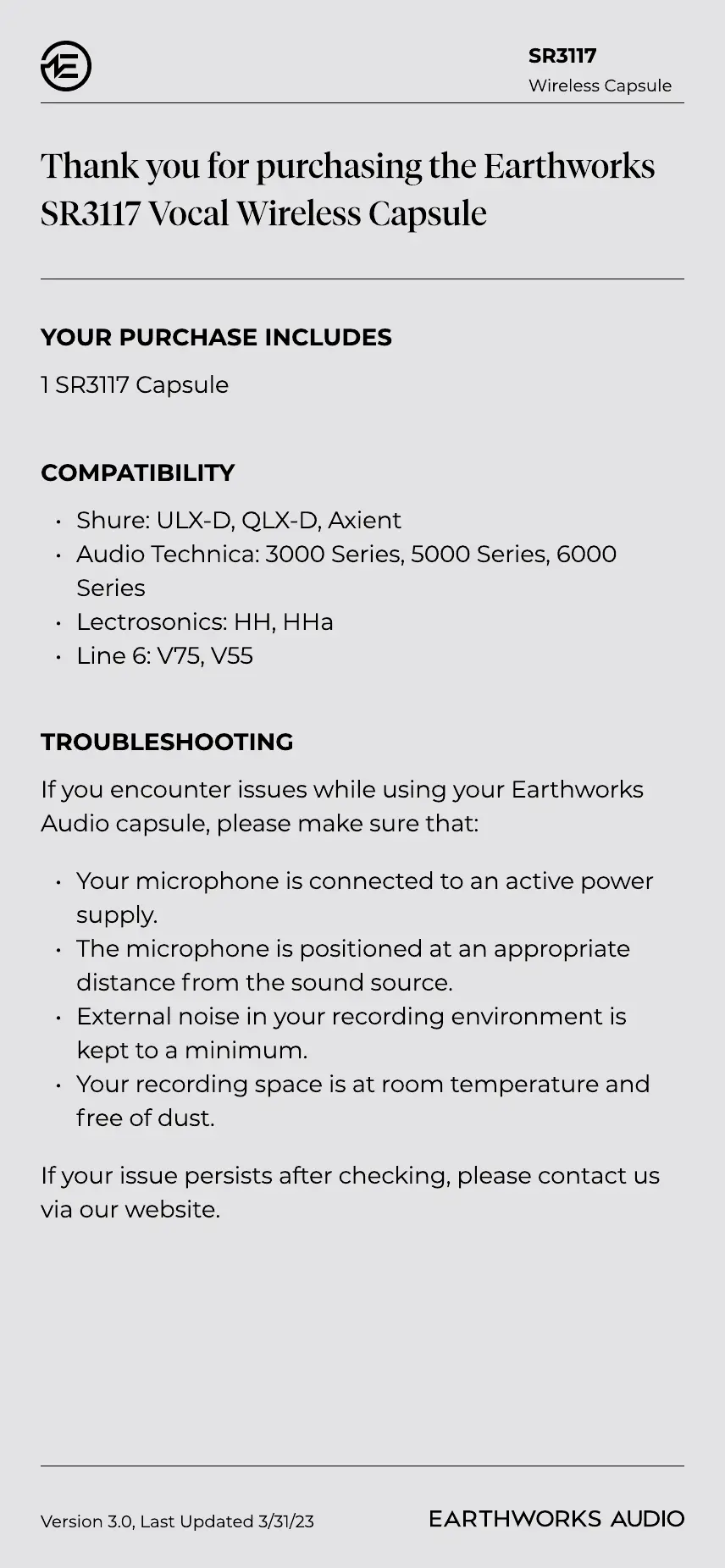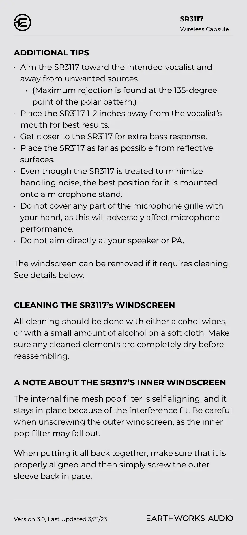 Olvassa el alább 📖 a magyar nyelvű használati útmutatót Earthworks SR3117 (5 oldal) a mikrofon kategóriában. Ezt az útmutatót 18 ember találta hasznosnak és 9.5 felhasználó értékelte átlagosan 3.7 csillagra