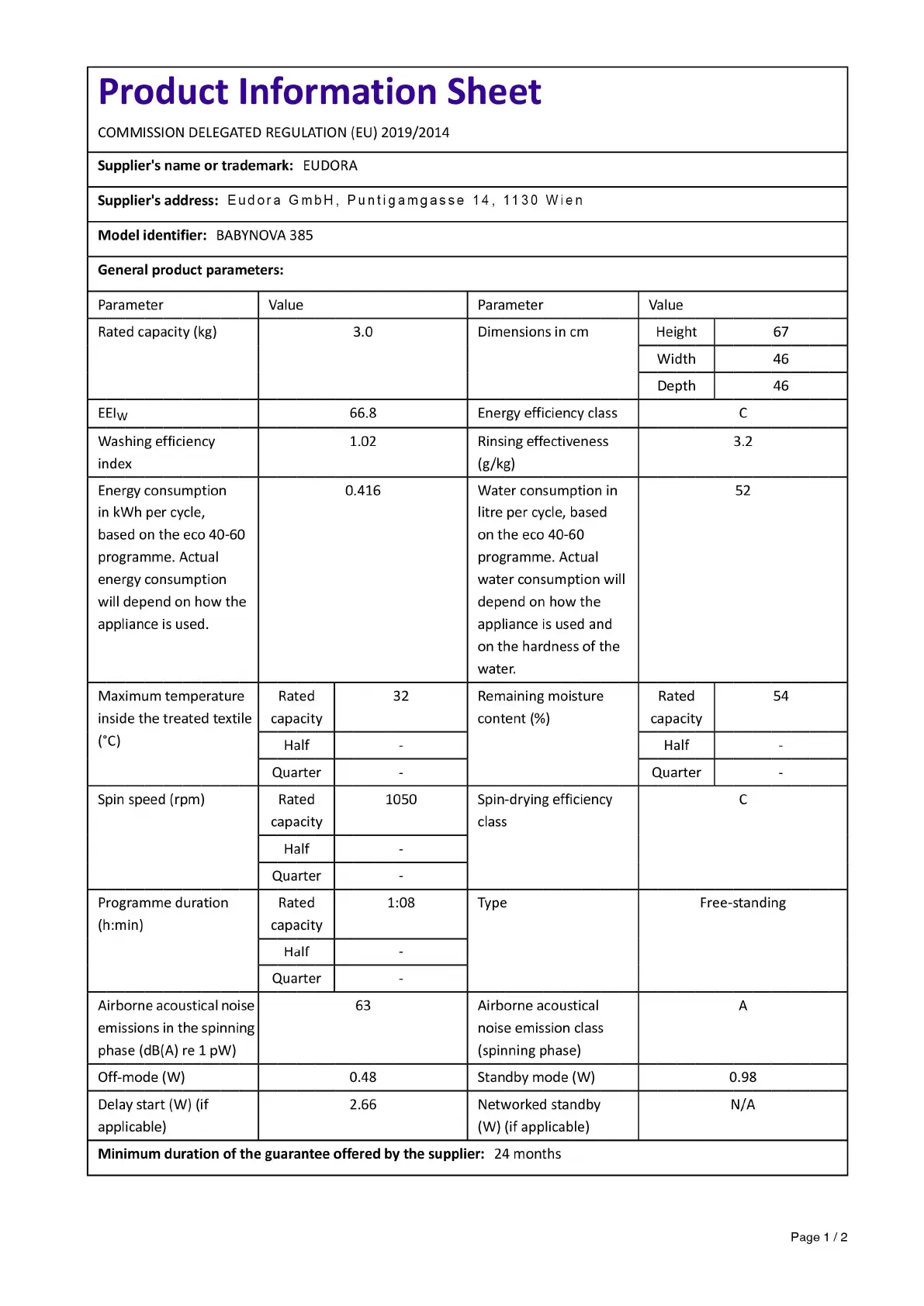 Olvassa el alább 📖 a magyar nyelvű használati útmutatót Eudora BABYNOVA 385 (28 oldal) a mosógép kategóriában. Ezt az útmutatót 9 ember találta hasznosnak és 5 felhasználó értékelte átlagosan 4.8 csillagra