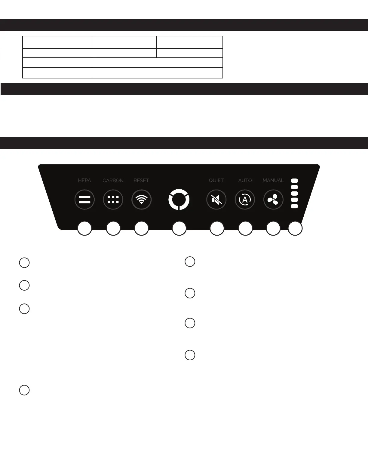 HEPA FILTER – Press for 2s: reset the life counter of the HEPA filter.