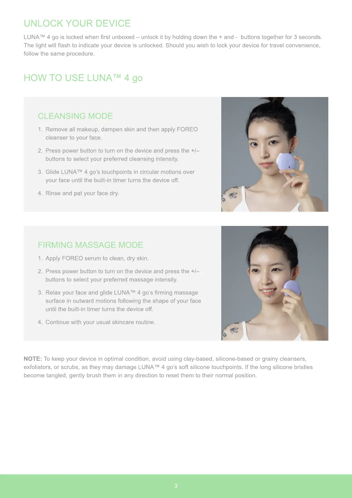exfoliators, or scrubs, as they may damage LUNA™ 4 go’s soft silicone touchpoints. If the long silicone bristles