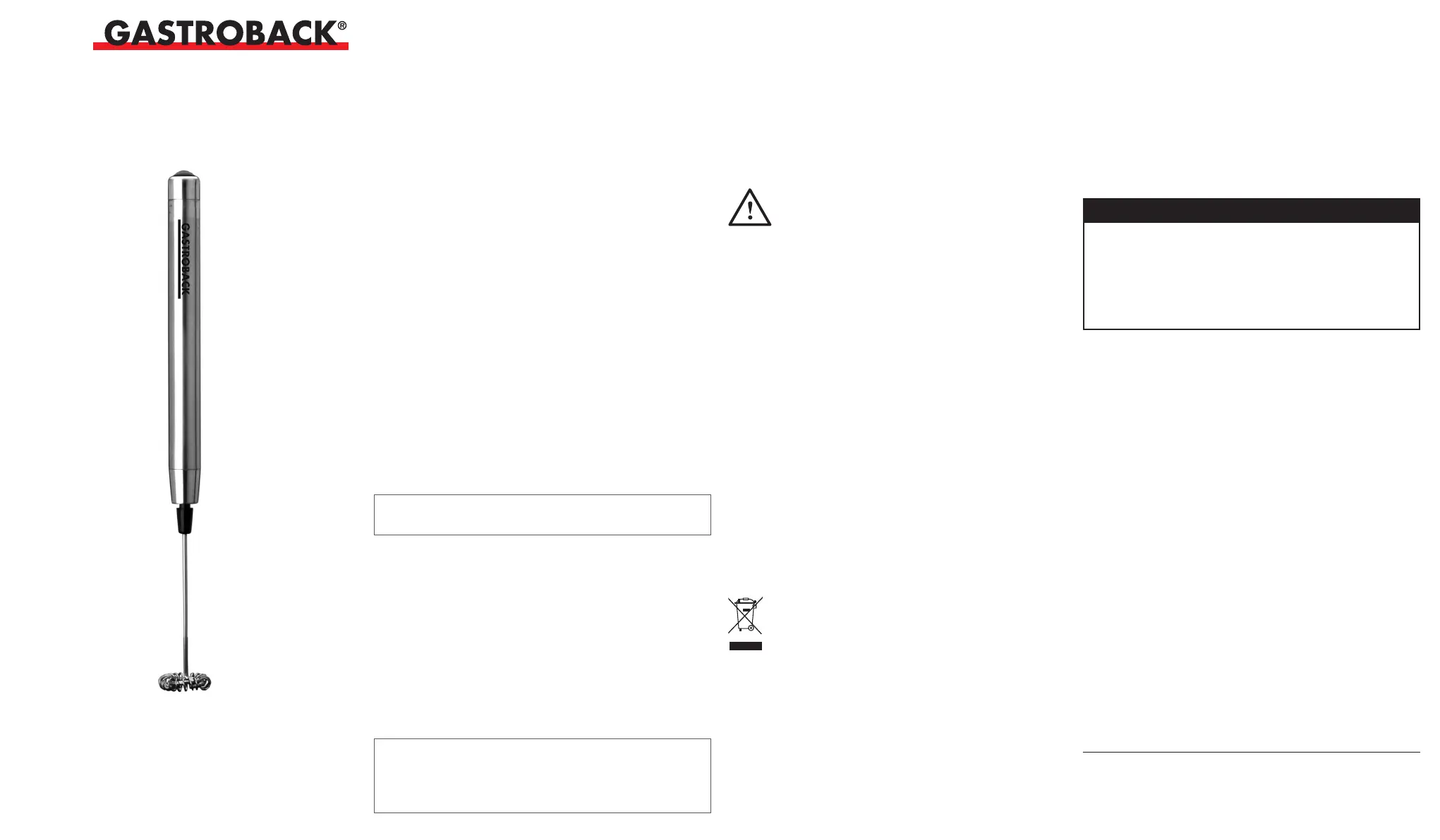 Olvassa el alább 📖 a magyar nyelvű használati útmutatót Gastroback 42215 (4 oldal) a tejhabosító kategóriában. Ezt az útmutatót 14 ember találta hasznosnak és 7.5 felhasználó értékelte átlagosan 5.0 csillagra