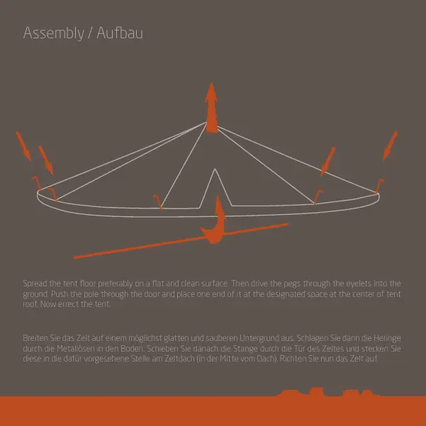 durch die Metallösen in den Boden. Schieben Sie danach die Stange durch die Tür des Zeltes und stecken Sie