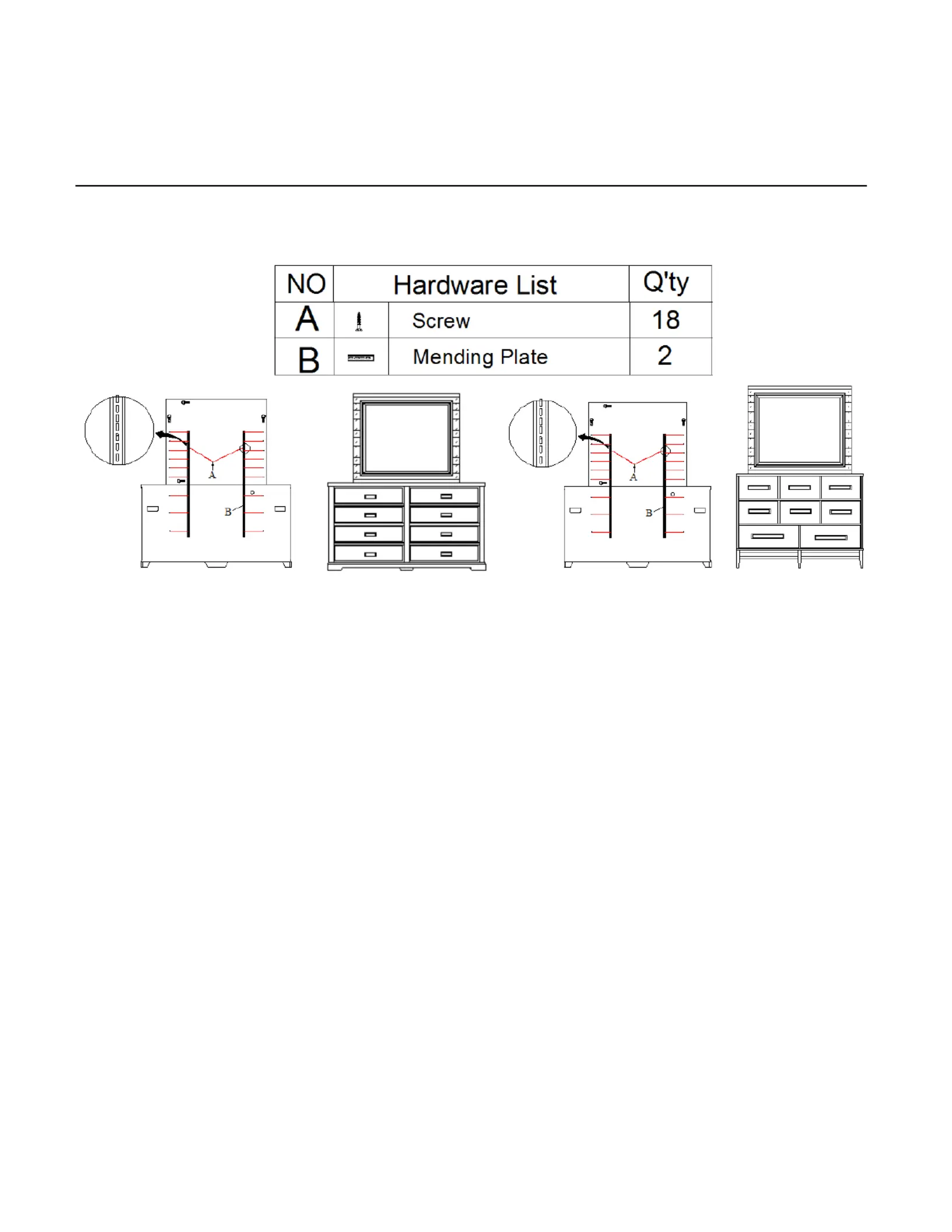 2. Attach a mending plate (B) at back of mirror and back of dresser. Align holes on mending plate