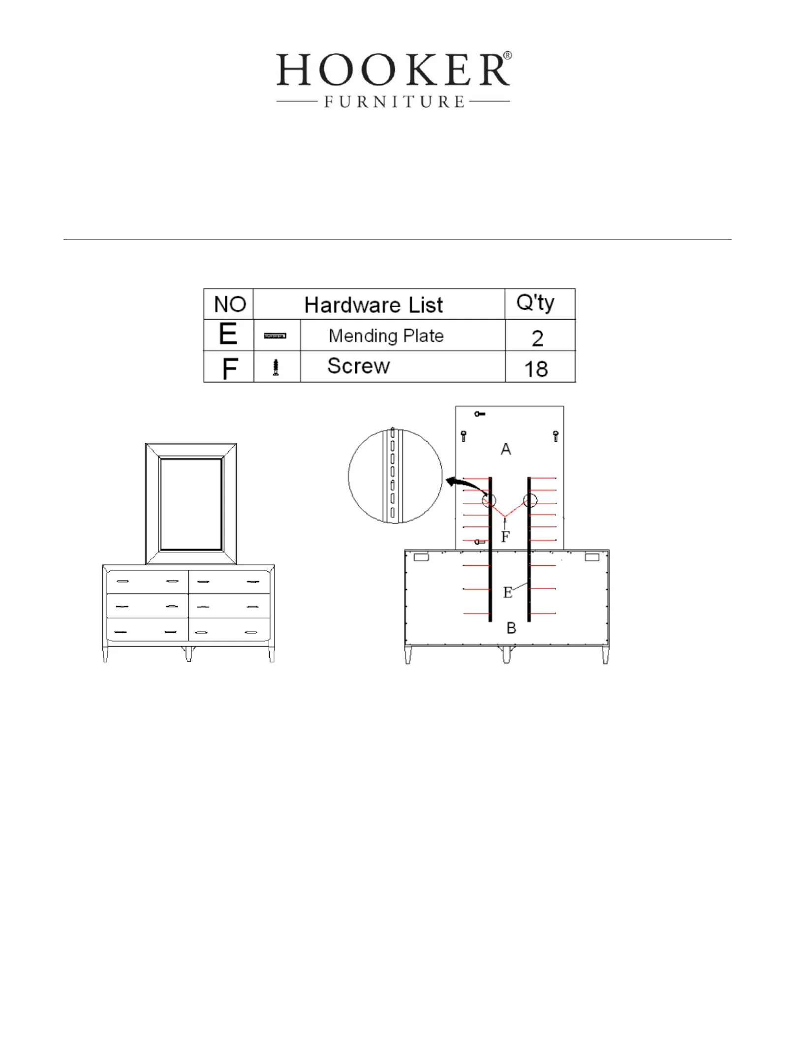 2 Attach . a mending plate (E) at back of mirror and back of dresser. Align holes on mending plate