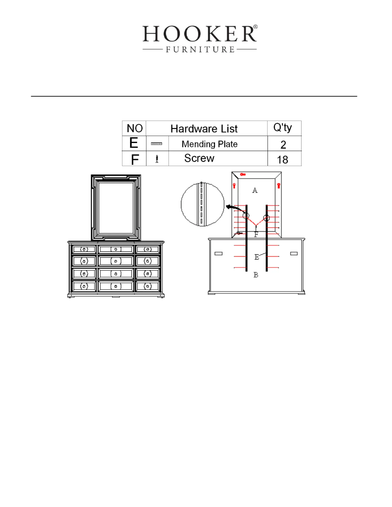 2. Attach a mending plate (E) at back of mirror and back of dresser. Align holes on mending plate