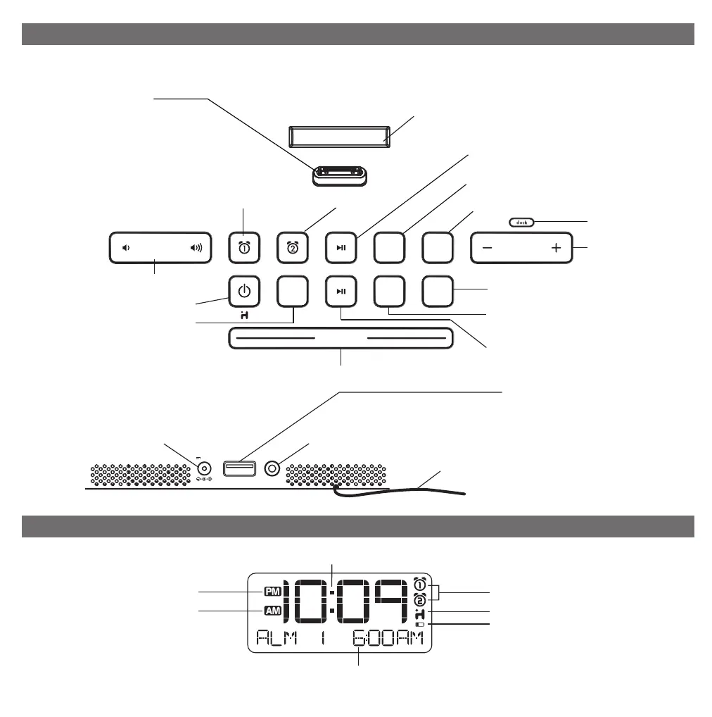 Alarm Time /EQ/ Mode Display (Dock/USB Dock/FM/Aux-in)