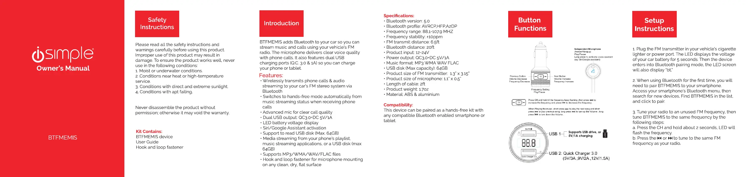 Olvassa el alább 📖 a magyar nyelvű használati útmutatót ISimple BTFMEMIS (2 oldal) a FM-adó kategóriában. Ezt az útmutatót 15 ember találta hasznosnak és 8 felhasználó értékelte átlagosan 4.3 csillagra