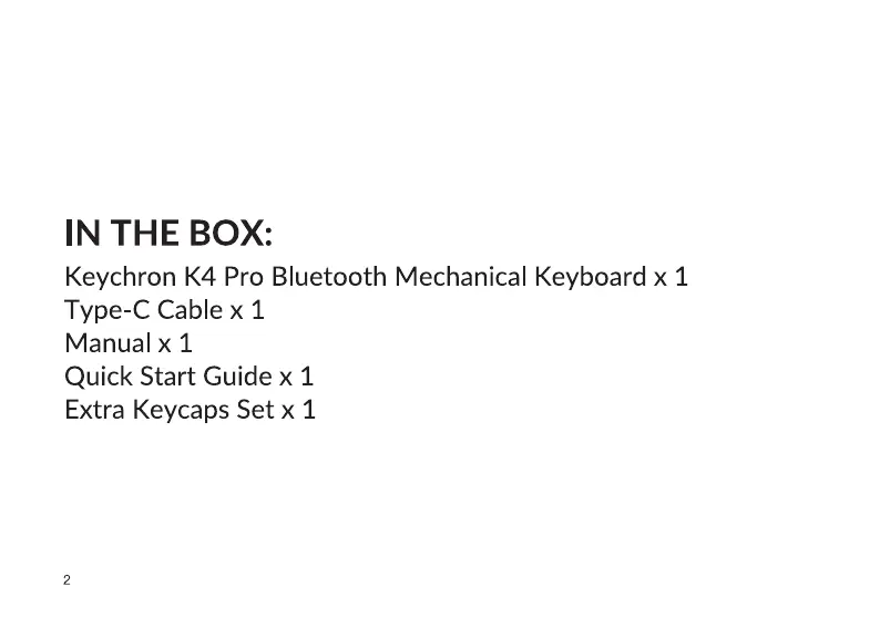 Olvassa el alább 📖 a magyar nyelvű használati útmutatót Keychron K4 Pro (40 oldal) a billentyűzet kategóriában. Ezt az útmutatót 11 ember találta hasznosnak és 6 felhasználó értékelte átlagosan 4.7 csillagra