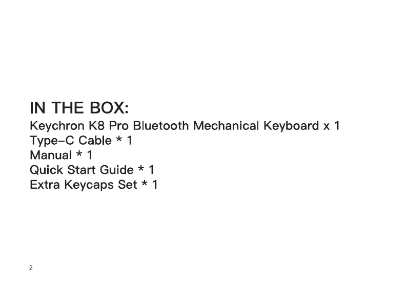 Olvassa el alább 📖 a magyar nyelvű használati útmutatót Keychron K8 Pro (40 oldal) a billentyűzet kategóriában. Ezt az útmutatót 11 ember találta hasznosnak és 6 felhasználó értékelte átlagosan 4.6 csillagra
