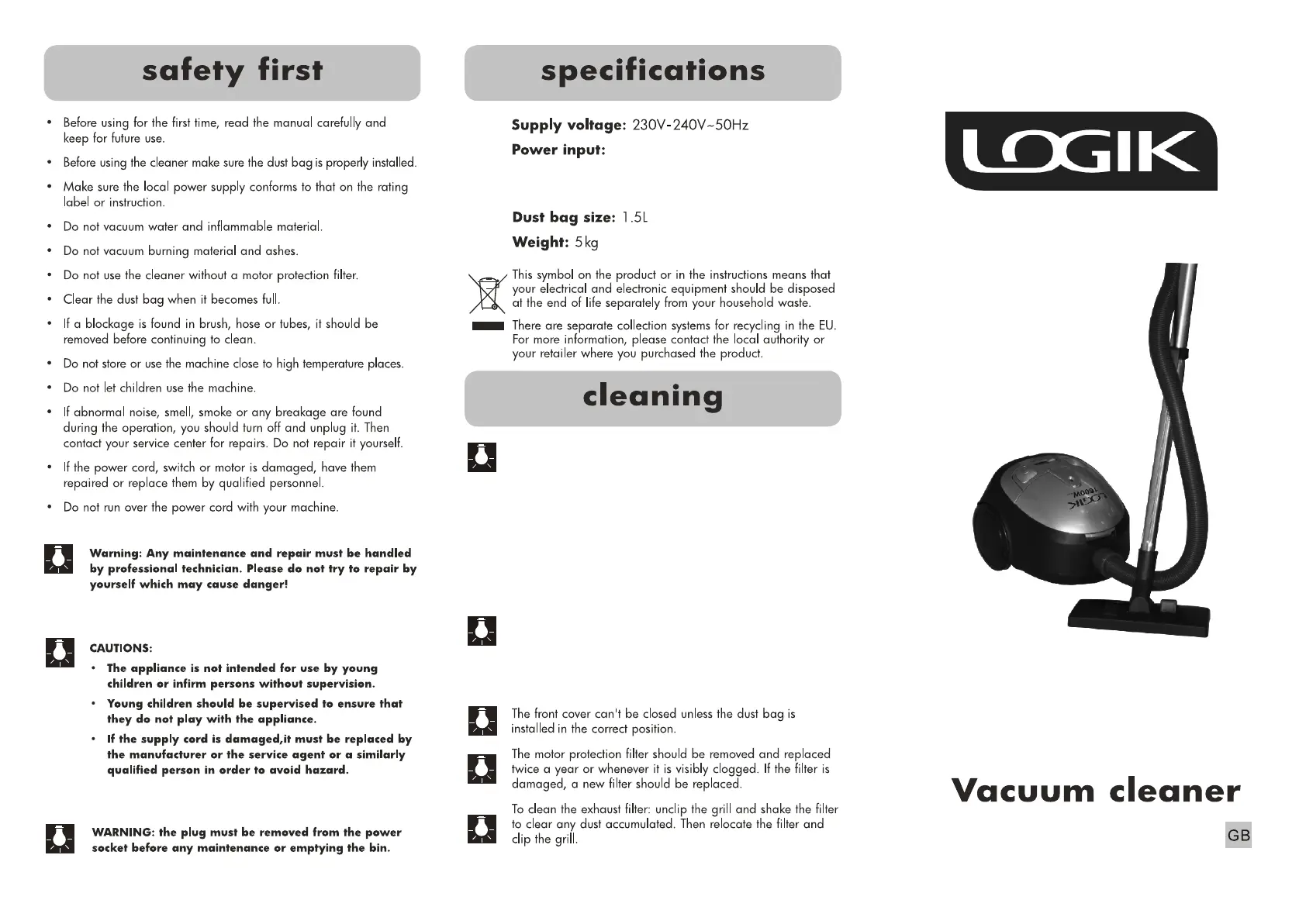 Olvassa el alább 📖 a magyar nyelvű használati útmutatót Logik LVC1600BME (4 oldal) a porszívó kategóriában. Ezt az útmutatót 16 ember találta hasznosnak és 8.5 felhasználó értékelte átlagosan 3.8 csillagra
