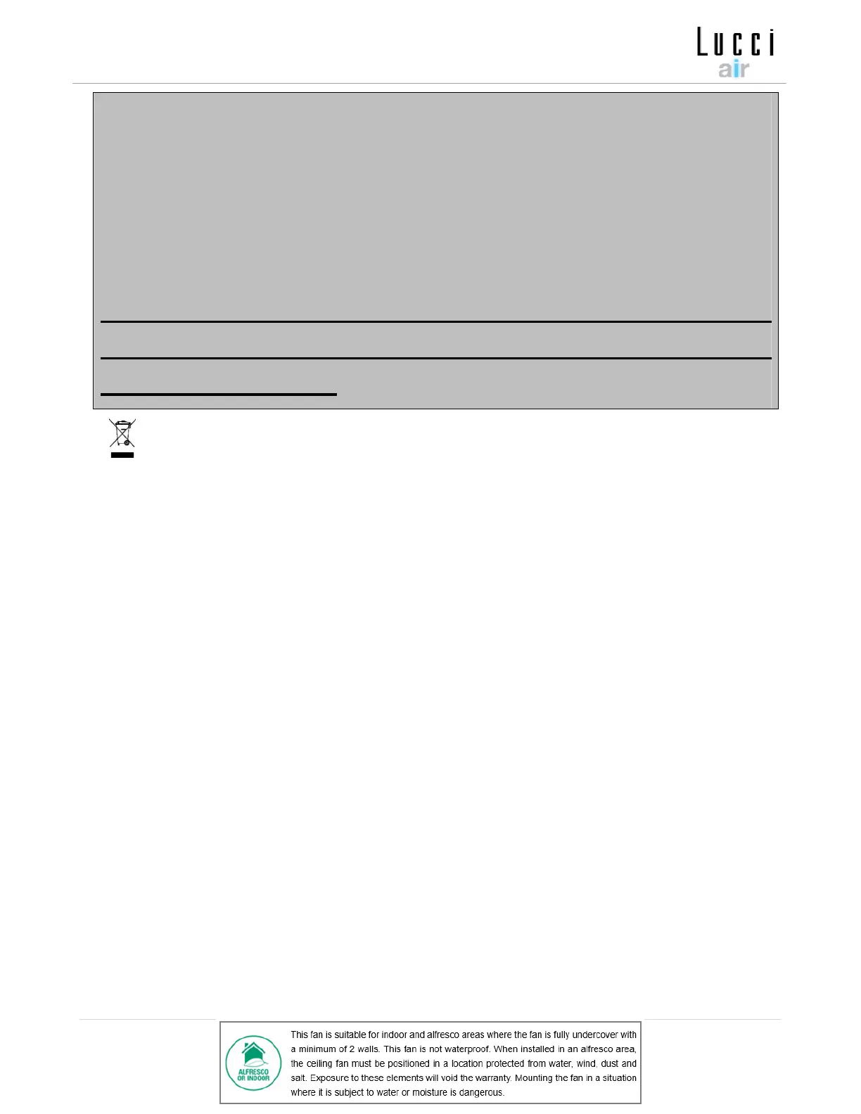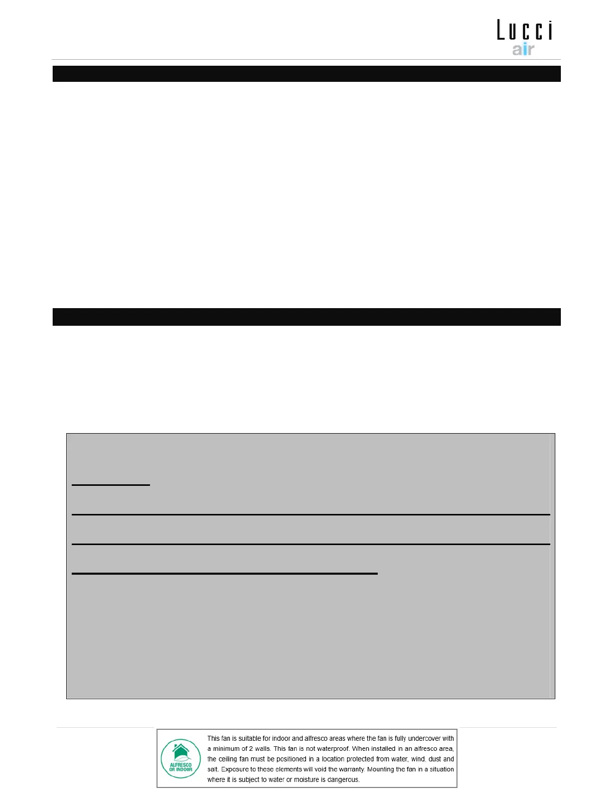 walls. This fan is not waterproof. When installed in an alfresco area, the ceiling fan must be positioned in