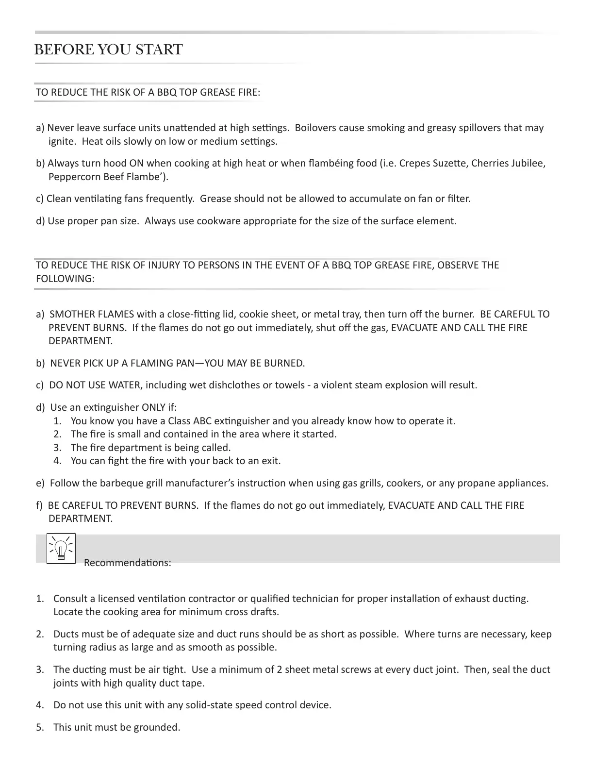 READ THIS MANUAL CAREFULLY and completely before using your vent hood to reduce the risk of: