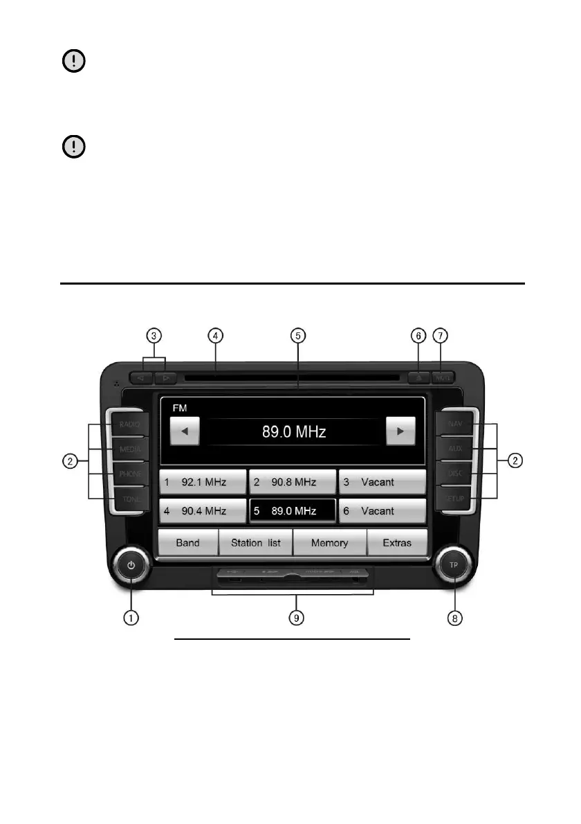 − RADIO : Switch back to radio mode or changes the waveband (FM/ MW /