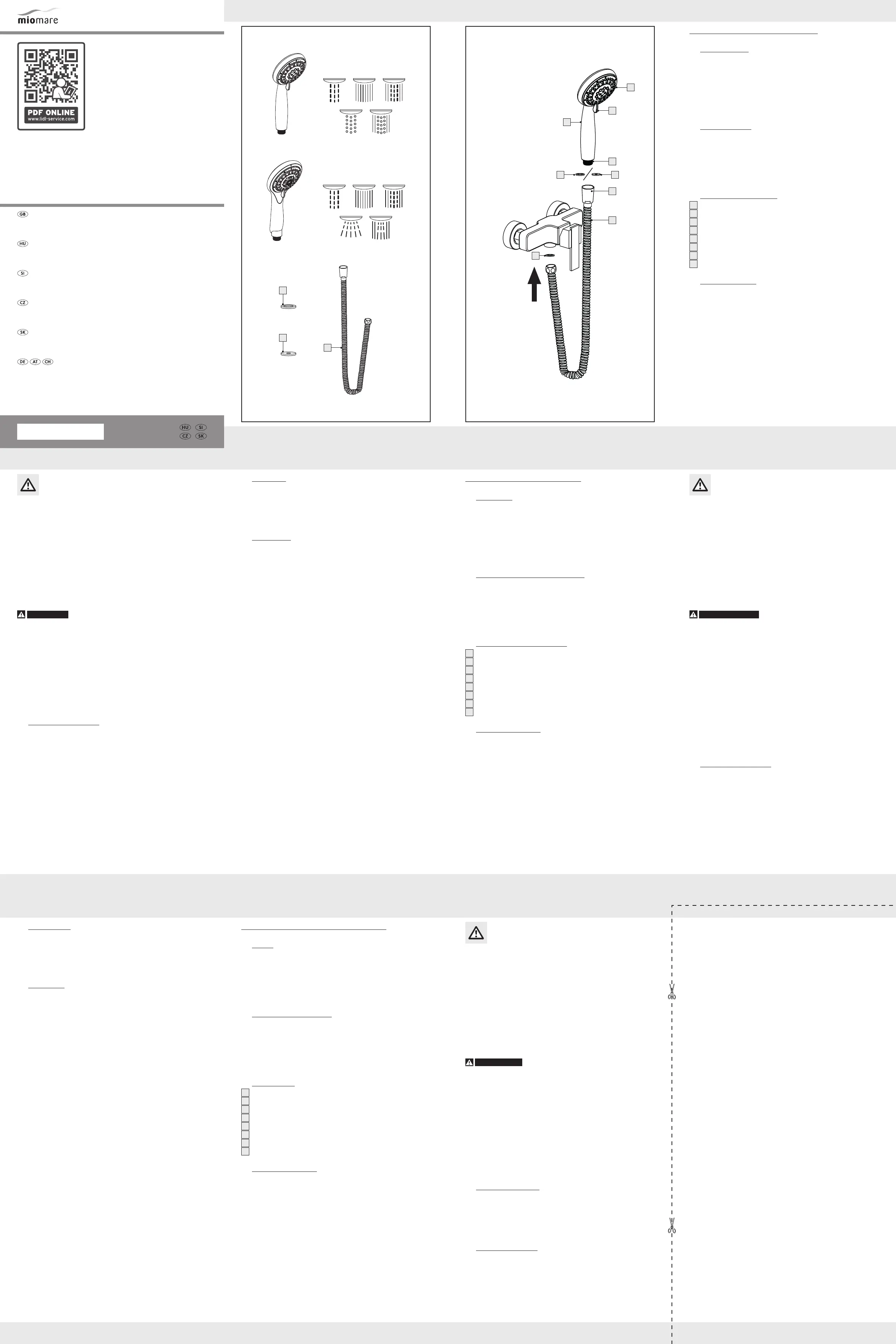 Olvassa el alább 📖 a magyar nyelvű használati útmutatót Miomare IAN 315301 (2 oldal) a zuhanyfej kategóriában. Ezt az útmutatót 13 ember találta hasznosnak és 7 felhasználó értékelte átlagosan 5.0 csillagra
