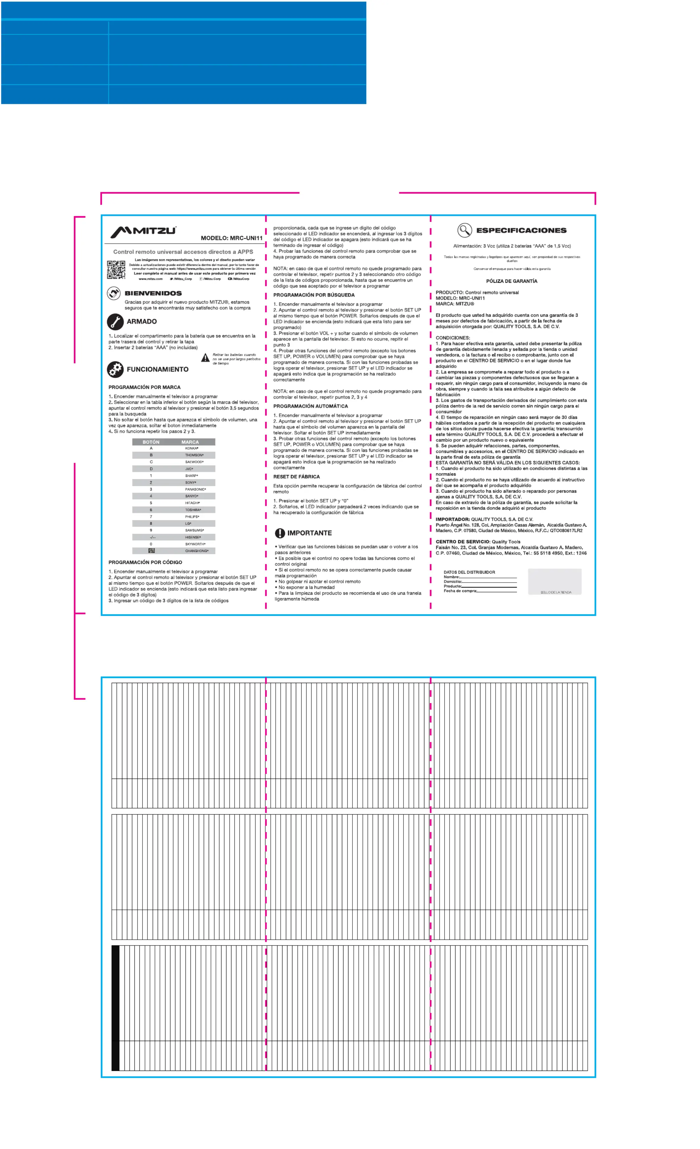 Olvassa el alább 📖 a magyar nyelvű használati útmutatót Mitzu MRC-UNI11 (1 oldal) a vezérlő kategóriában. Ezt az útmutatót 16 ember találta hasznosnak és 8.5 felhasználó értékelte átlagosan 3.6 csillagra