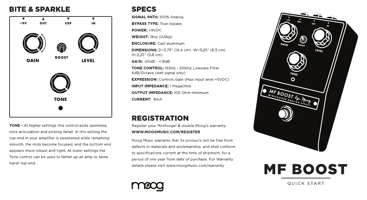 Olvassa el alább 📖 a magyar nyelvű használati útmutatót Moog Minifooger MF Boost (2 oldal) a nincs kategorizálva kategóriában. Ezt az útmutatót 23 ember találta hasznosnak és 12 felhasználó értékelte átlagosan 4.9 csillagra