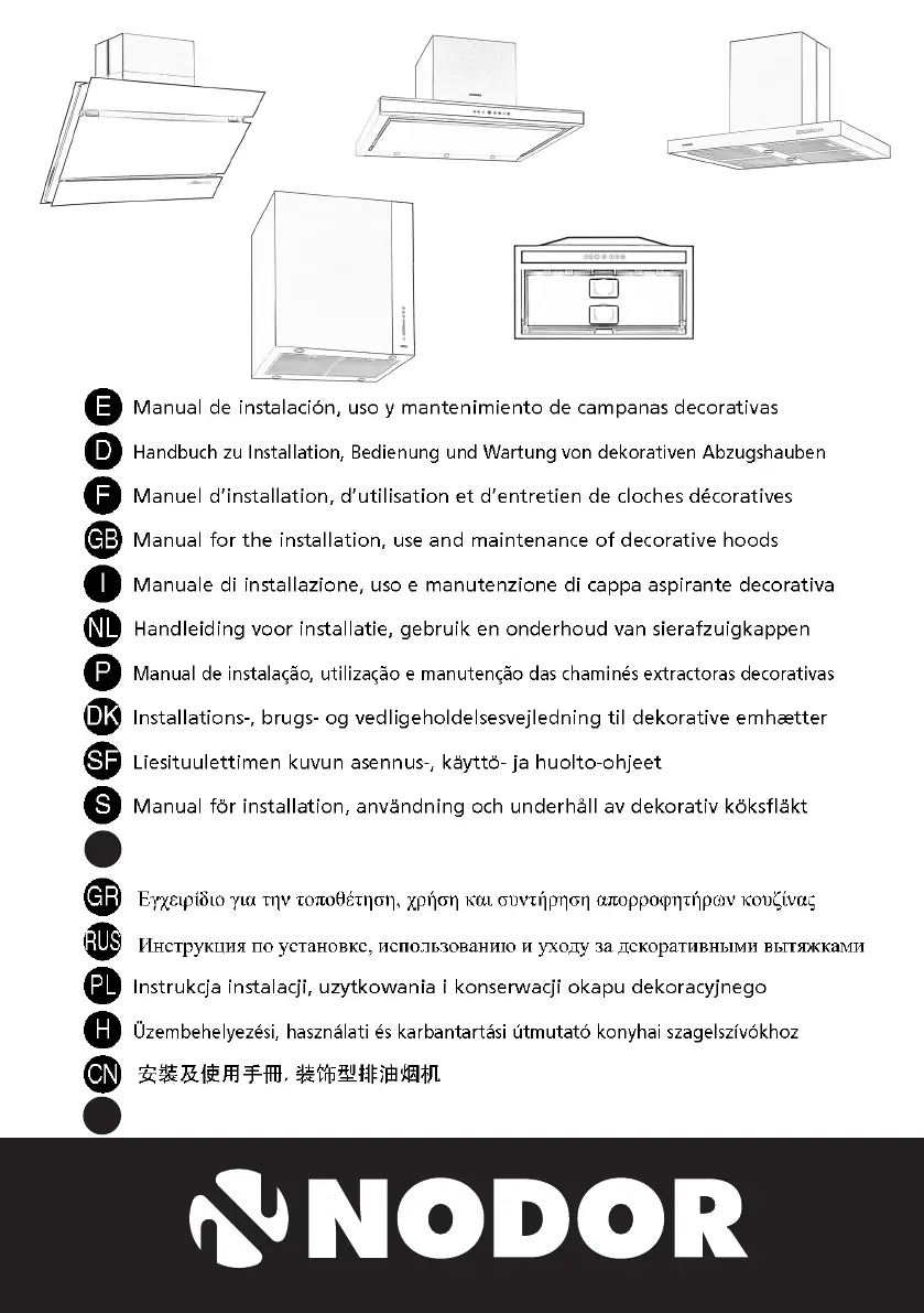 Installasjons-, bruks- og vedlikeholdsmanual for dekorative hetter