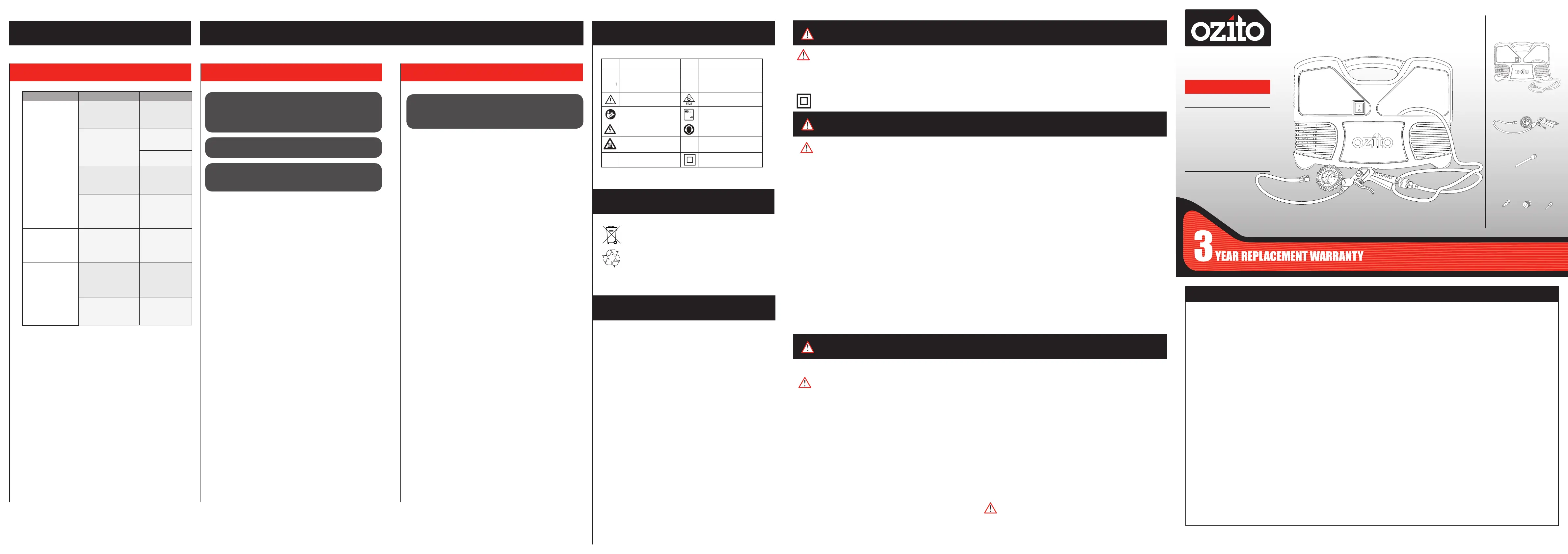 Olvassa el alább 📖 a magyar nyelvű használati útmutatót Ozito ACK-0015 (2 oldal) a kompresszor kategóriában. Ezt az útmutatót 19 ember találta hasznosnak és 10 felhasználó értékelte átlagosan 5.0 csillagra
