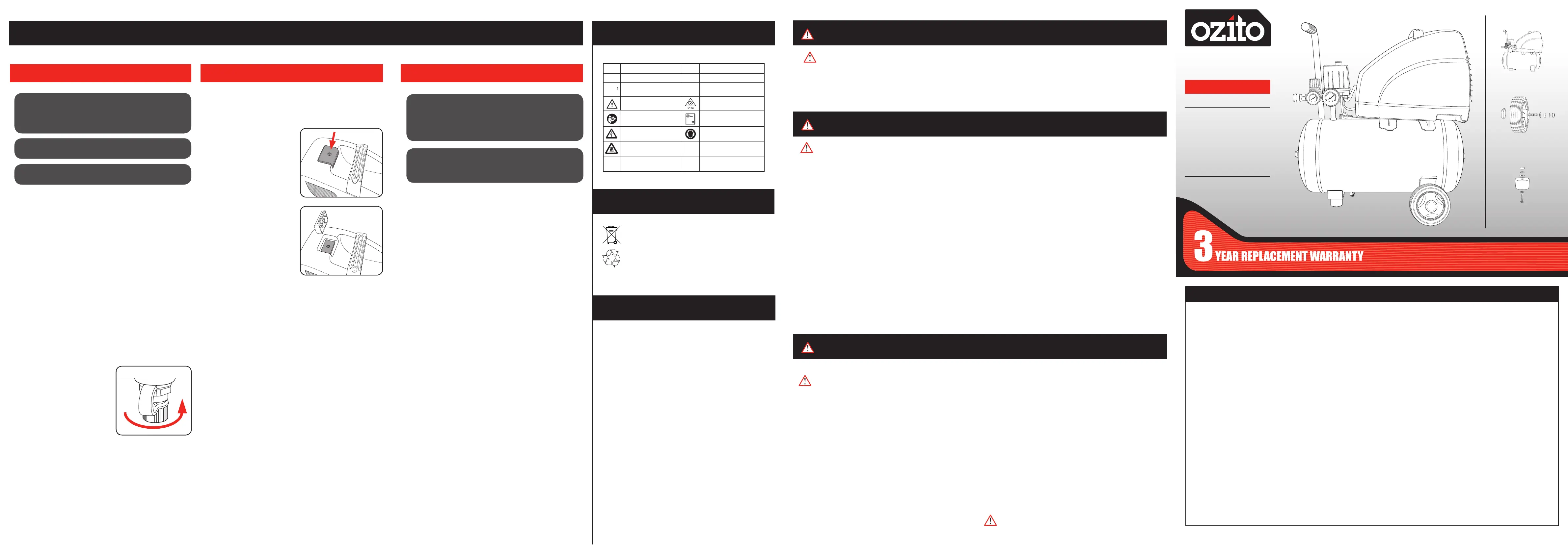Olvassa el alább 📖 a magyar nyelvű használati útmutatót Ozito ACP-2415 (2 oldal) a kompresszor kategóriában. Ezt az útmutatót 13 ember találta hasznosnak és 7 felhasználó értékelte átlagosan 4.8 csillagra