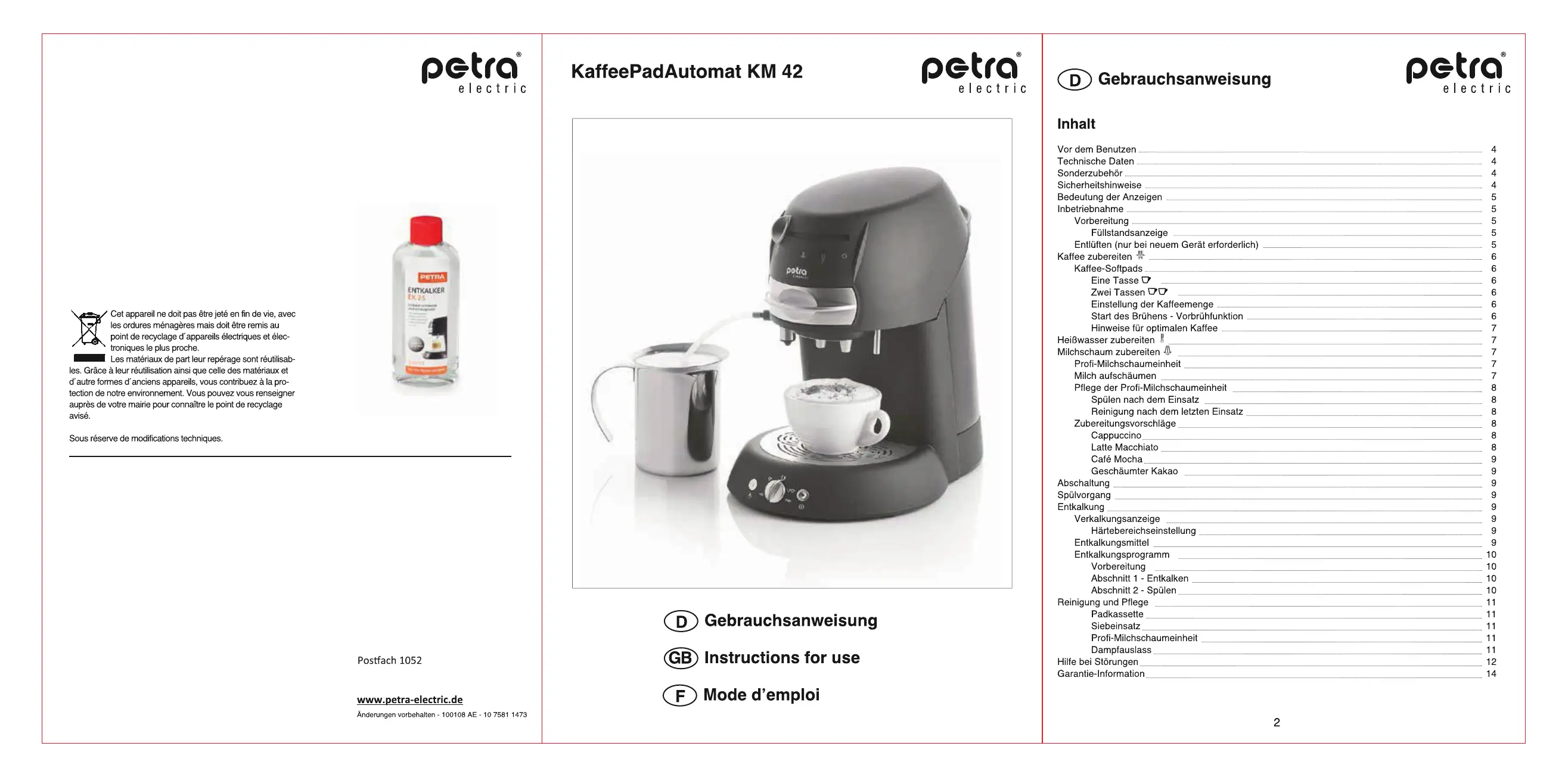 Olvassa el alább 📖 a magyar nyelvű használati útmutatót Petra Electric KM 42.17 (68 oldal) a kávégép kategóriában. Ezt az útmutatót 8 ember találta hasznosnak és 7 felhasználó értékelte átlagosan 4.2 csillagra