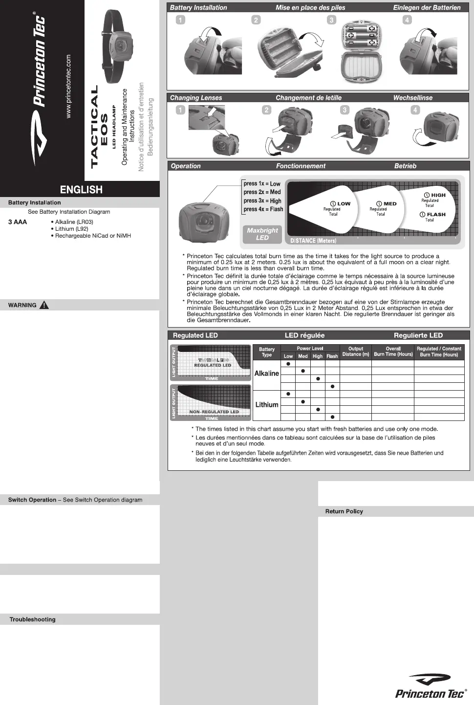 Olvassa el alább 📖 a magyar nyelvű használati útmutatót Princeton Tec EOS Tactical (2 oldal) a Zseblámpa kategóriában. Ezt az útmutatót 23 ember találta hasznosnak és 12 felhasználó értékelte átlagosan 5.0 csillagra