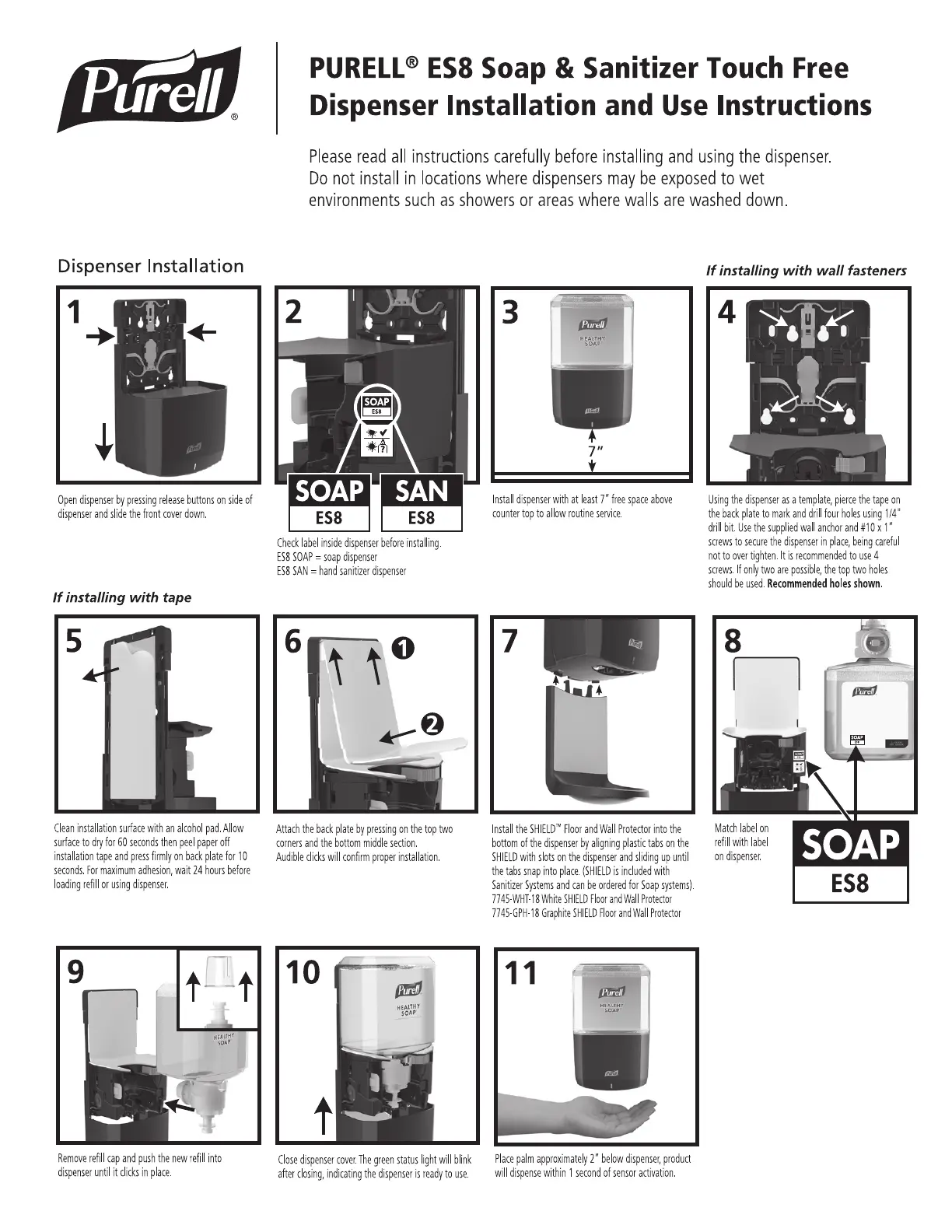 Olvassa el alább 📖 a magyar nyelvű használati útmutatót Purell ES8 (4 oldal) a Zeep adagolók kategóriában. Ezt az útmutatót 22 ember találta hasznosnak és 4 felhasználó értékelte átlagosan 4.8 csillagra