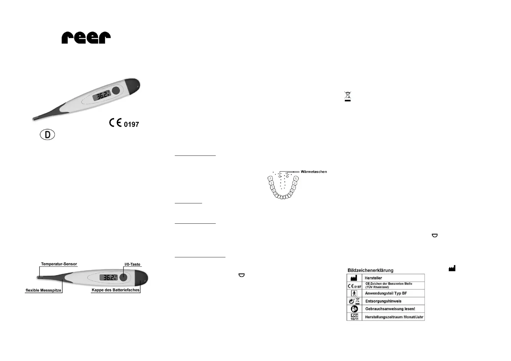 Olvassa el alább 📖 a magyar nyelvű használati útmutatót Reer SC 19 Flex (2 oldal) a Hőmérők kategóriában. Ezt az útmutatót 18 ember találta hasznosnak és 9.5 felhasználó értékelte átlagosan 4.7 csillagra