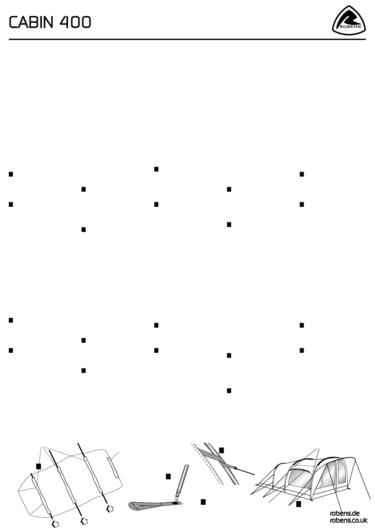 Olvassa el alább 📖 a magyar nyelvű használati útmutatót Robens Cabin 400 (2 oldal) a sátor kategóriában. Ezt az útmutatót 12 ember találta hasznosnak és 2 felhasználó értékelte átlagosan 4.6 csillagra