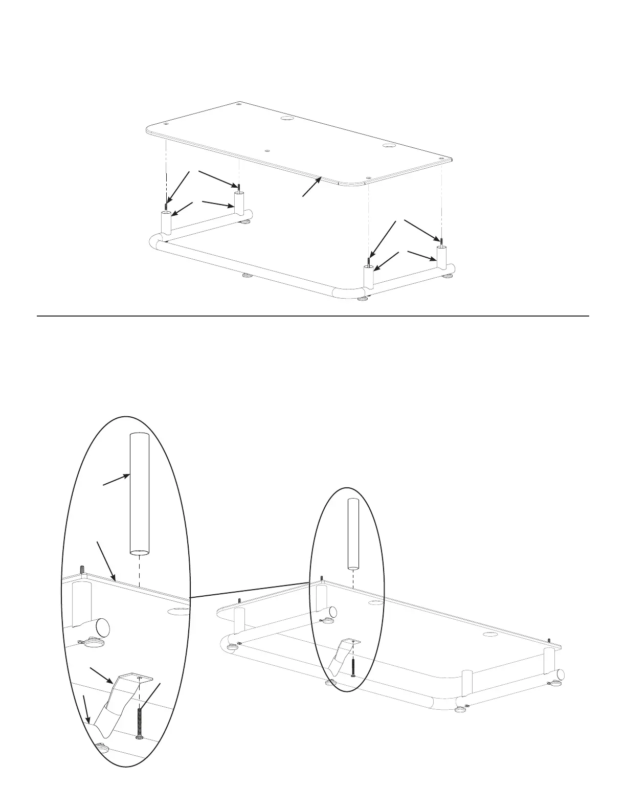 Align four holes in a Video Shelf (E) with the Shelf Connectors (H) threaded into the 3” Cope Tubes (B) in Step 2; then, place