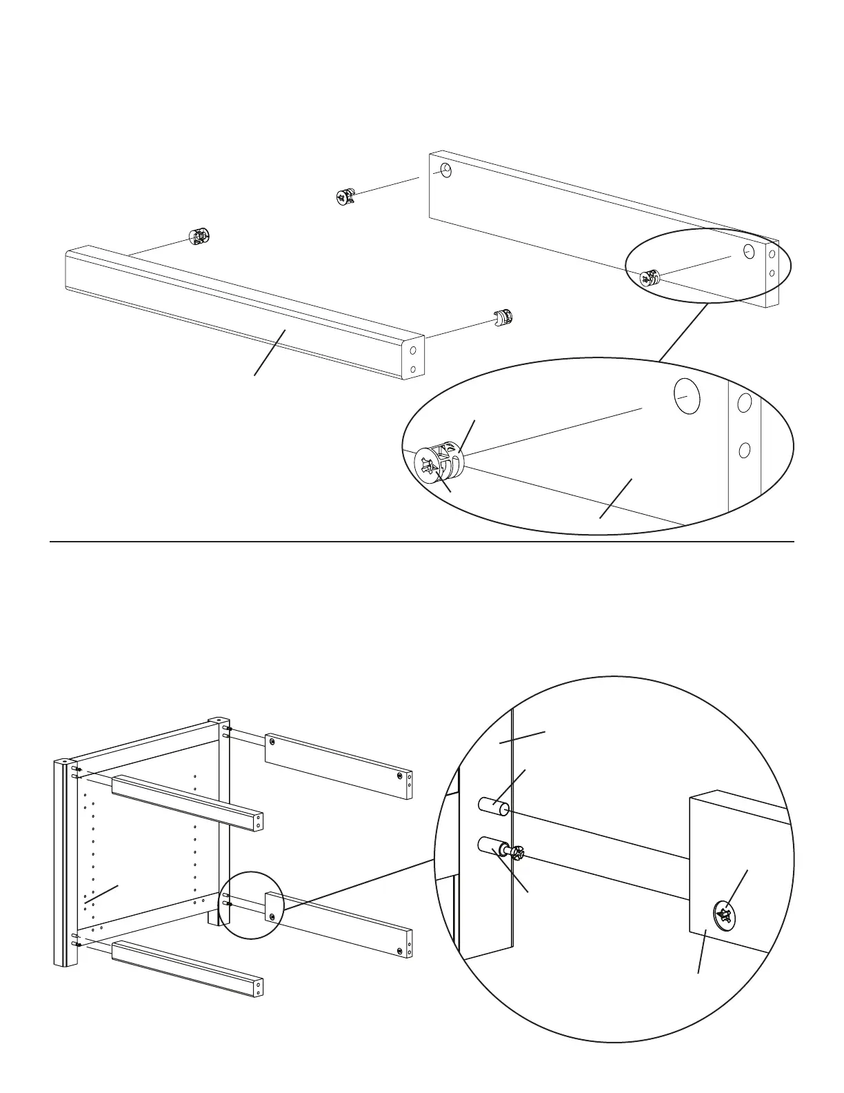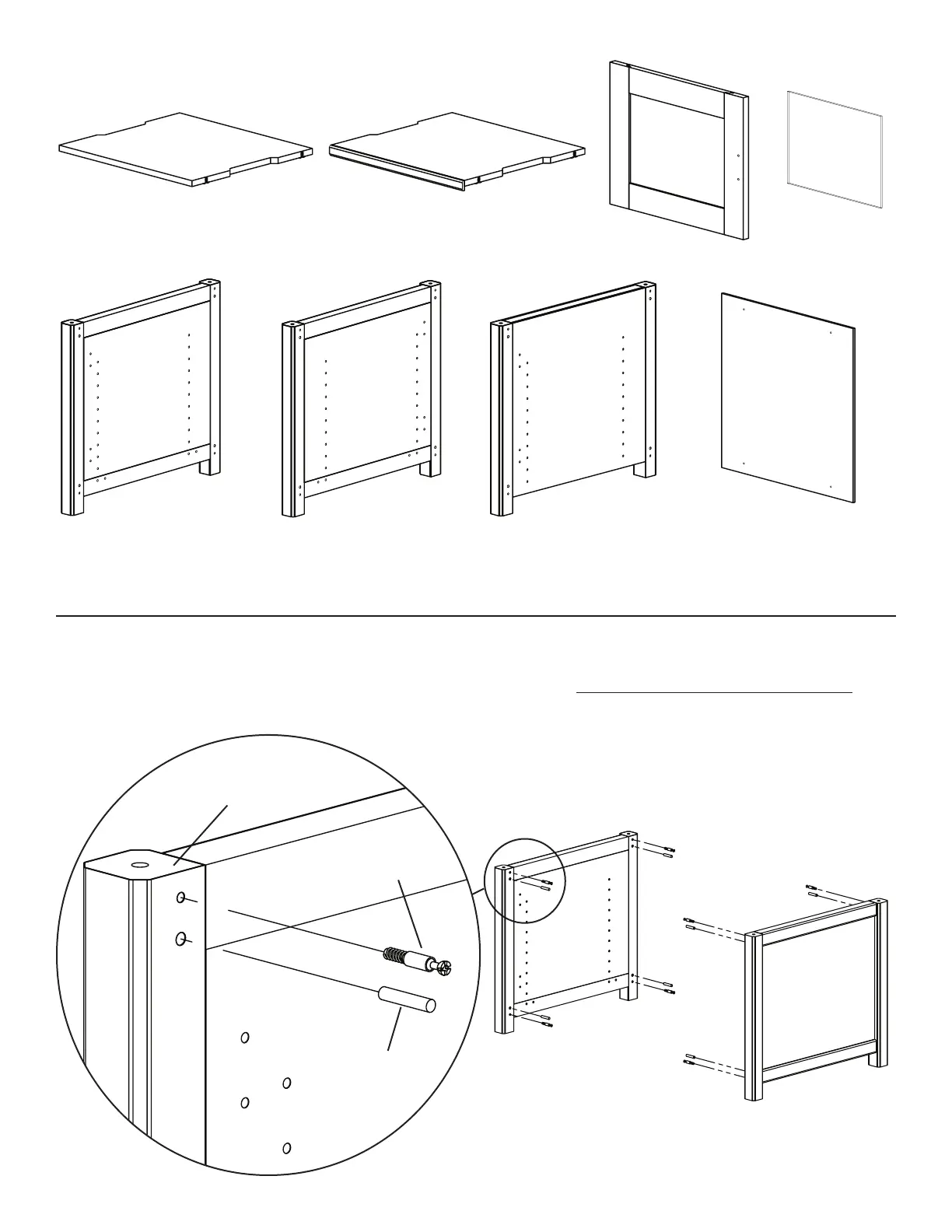 Add the Front and Back Stretchers (o,p) to the Side Panel (u), by aligning the Cam Pin (a) with the hole which the Cams (b) point to and