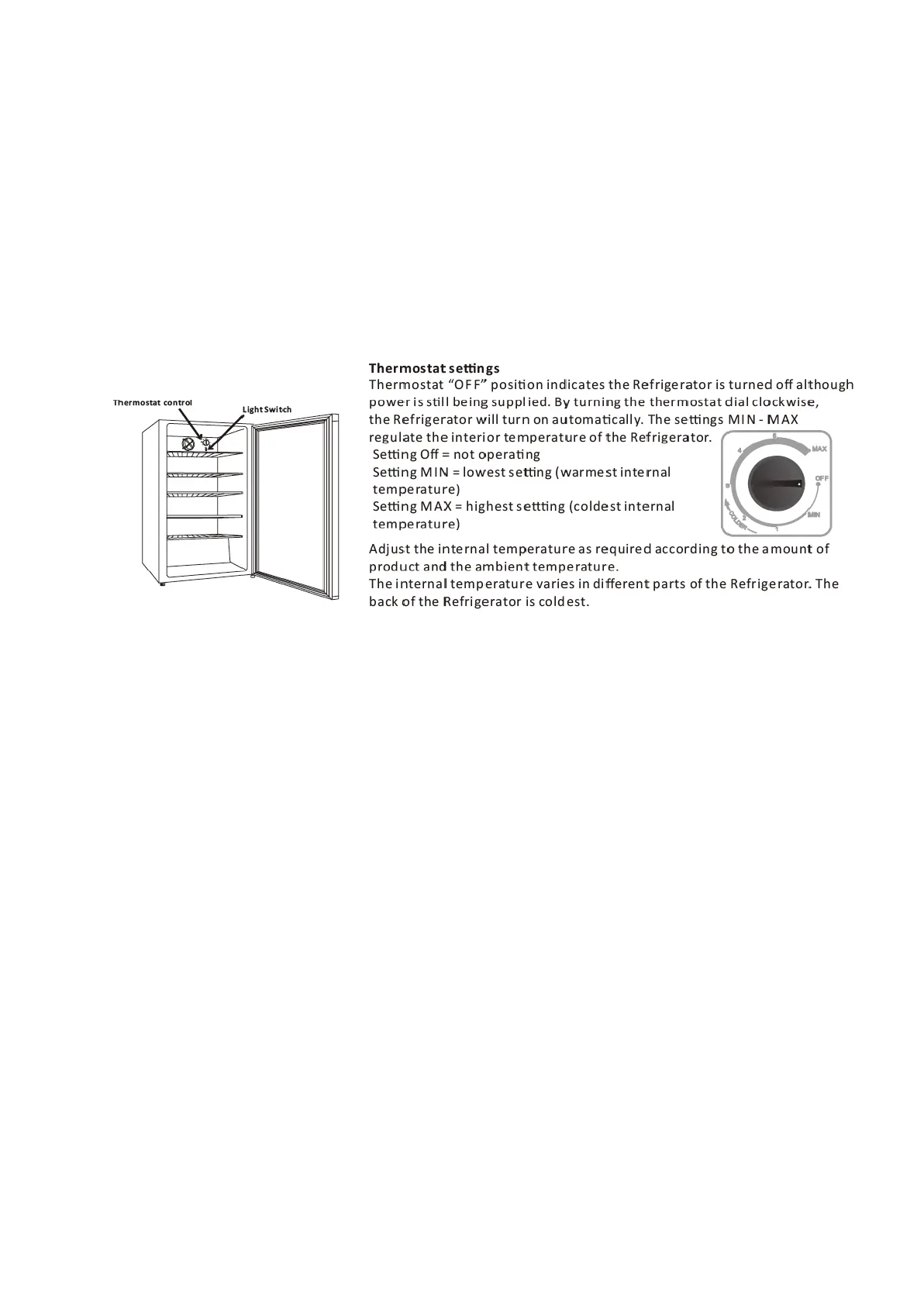 2. Thermostat temperature control and the LIGHT on/off switch is located inside unit, on rear wall to