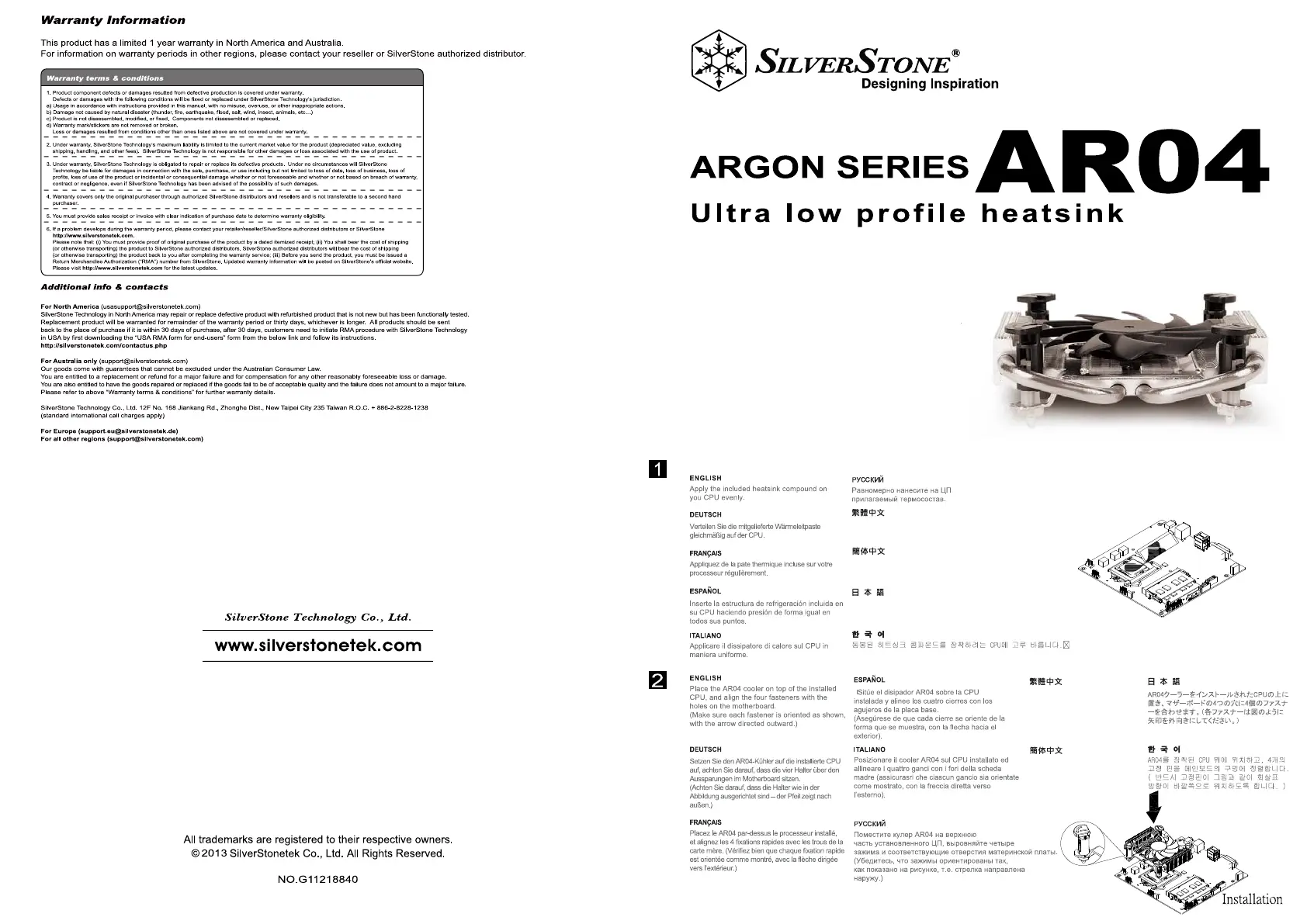 Olvassa el alább 📖 a magyar nyelvű használati útmutatót SilverStone Argon AR04 (4 oldal) a Processzorkoeler kategóriában. Ezt az útmutatót 18 ember találta hasznosnak és 9.5 felhasználó értékelte átlagosan 3.8 csillagra