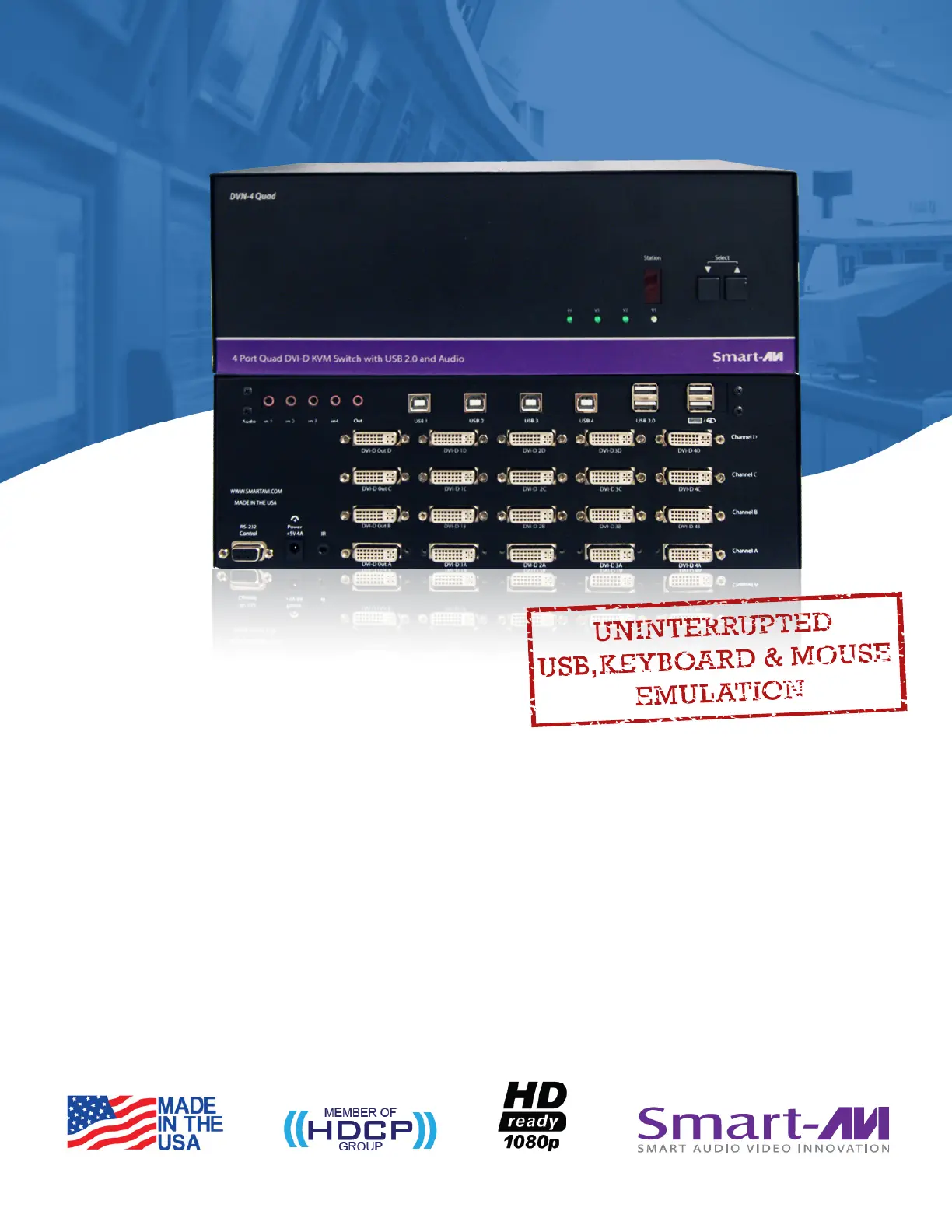 TheUSBemulationtechnologyutilizedbyDVN-4QuadenablesimmediatehotkeysourceswitchingthrougharemoteUSB