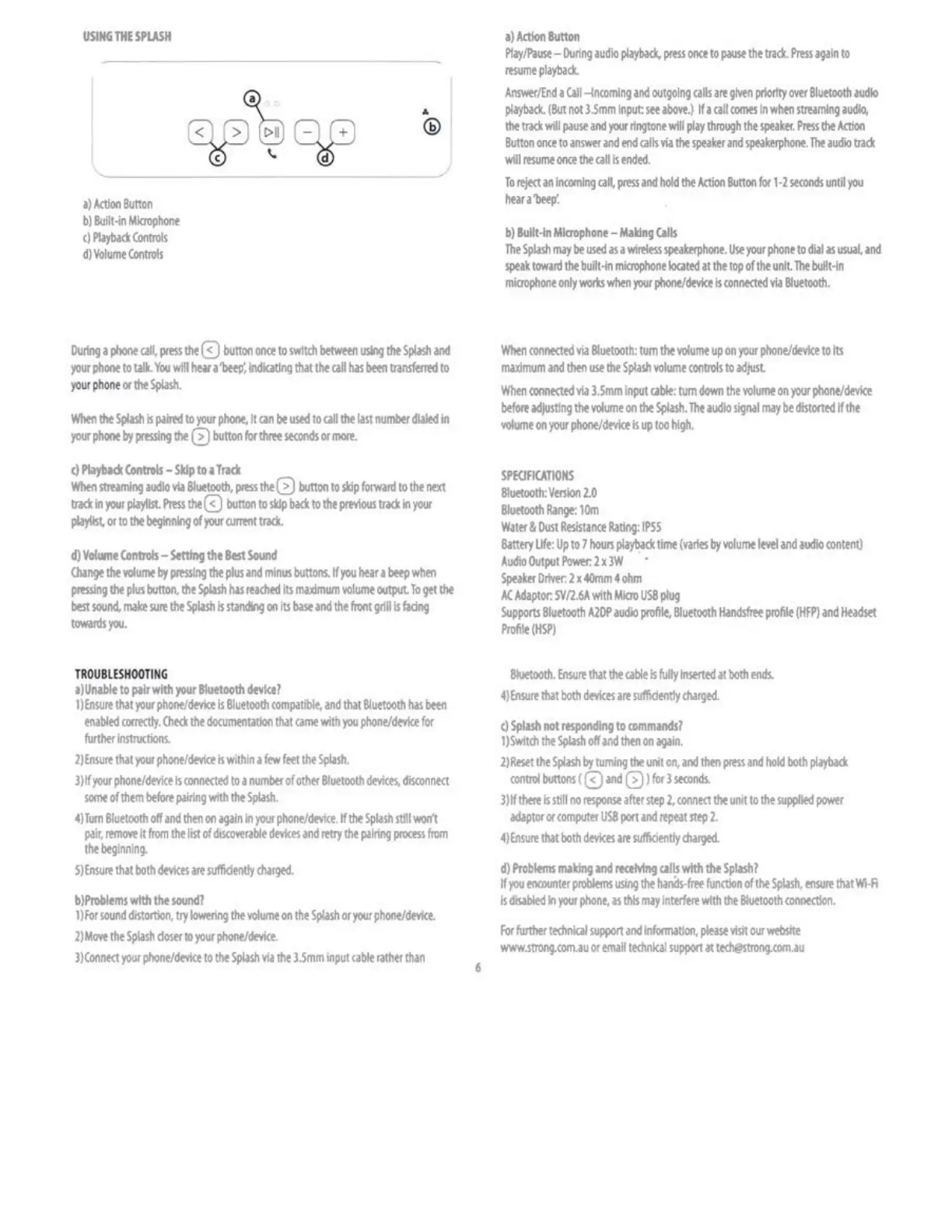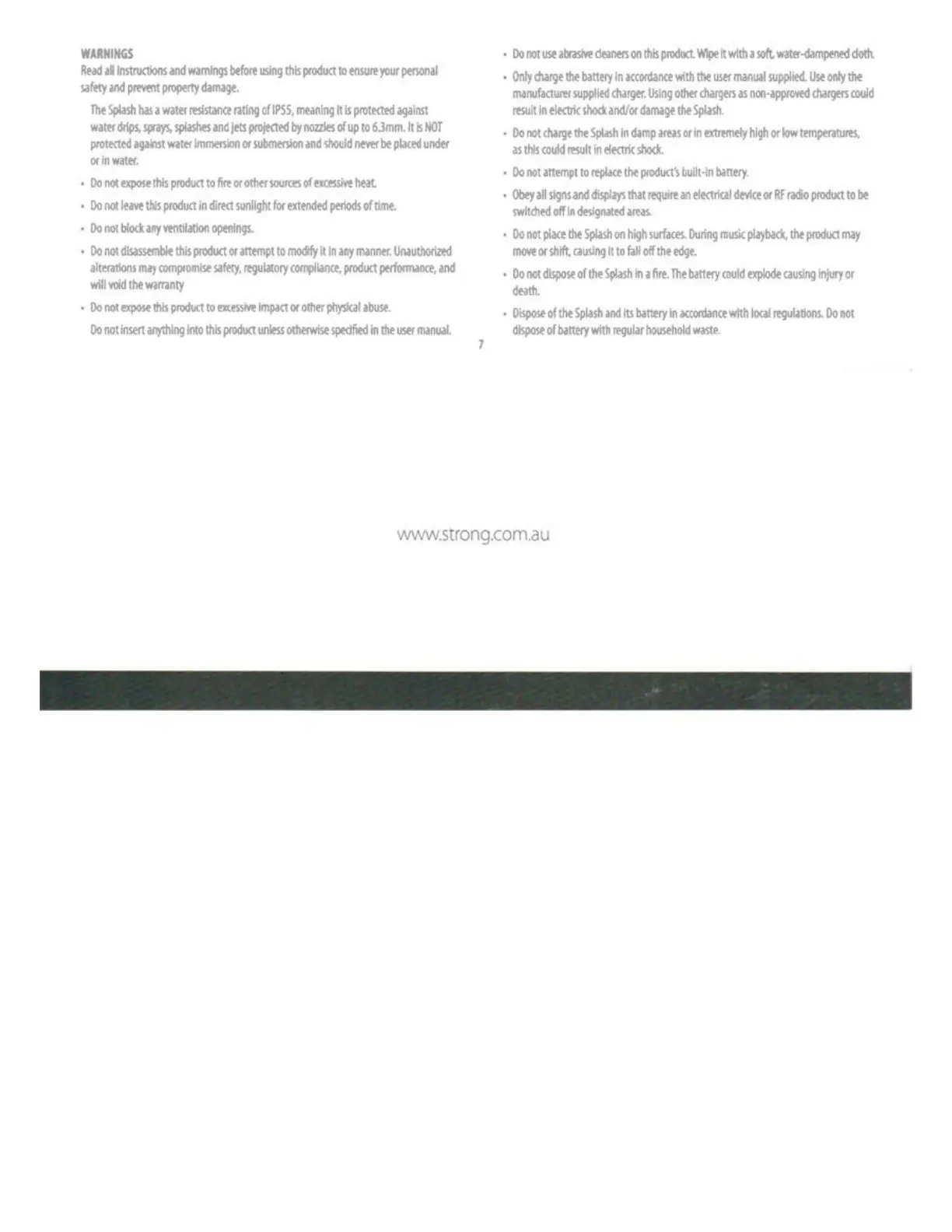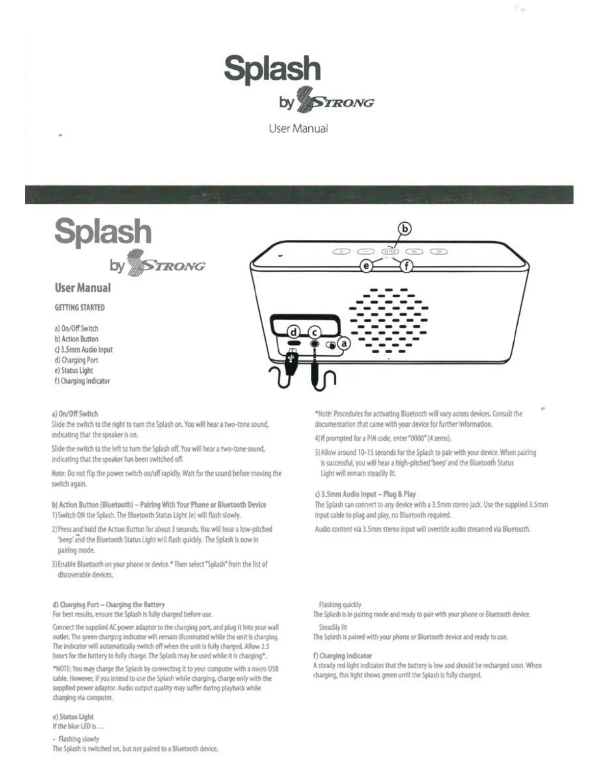 Olvassa el alább 📖 a magyar nyelvű használati útmutatót Strong Splash (3 oldal) a hangszóró kategóriában. Ezt az útmutatót 15 ember találta hasznosnak és 8 felhasználó értékelte átlagosan 4.3 csillagra
