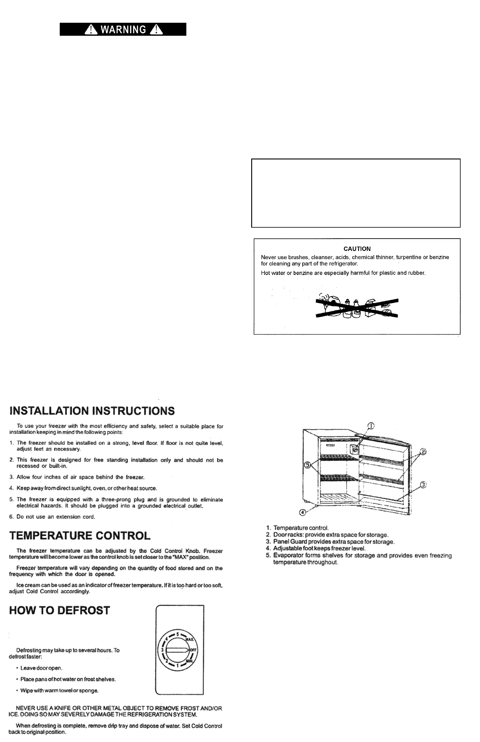・Never clean freezer parts with flammable fluids. These fumes can create a fire hazard or