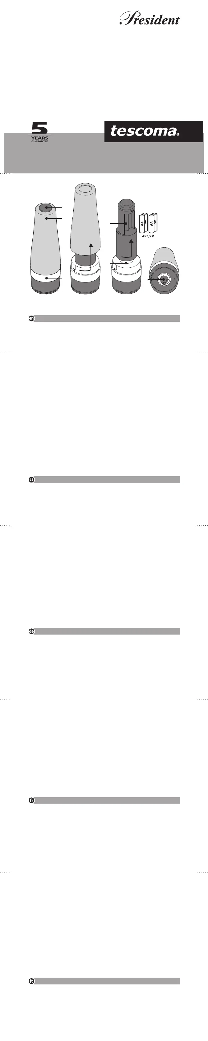 Olvassa el alább 📖 a magyar nyelvű használati útmutatót Tescoma President 659560 (2 oldal) a Só/borsdaráló kategóriában. Ezt az útmutatót 10 ember találta hasznosnak és 5.5 felhasználó értékelte átlagosan 4.4 csillagra