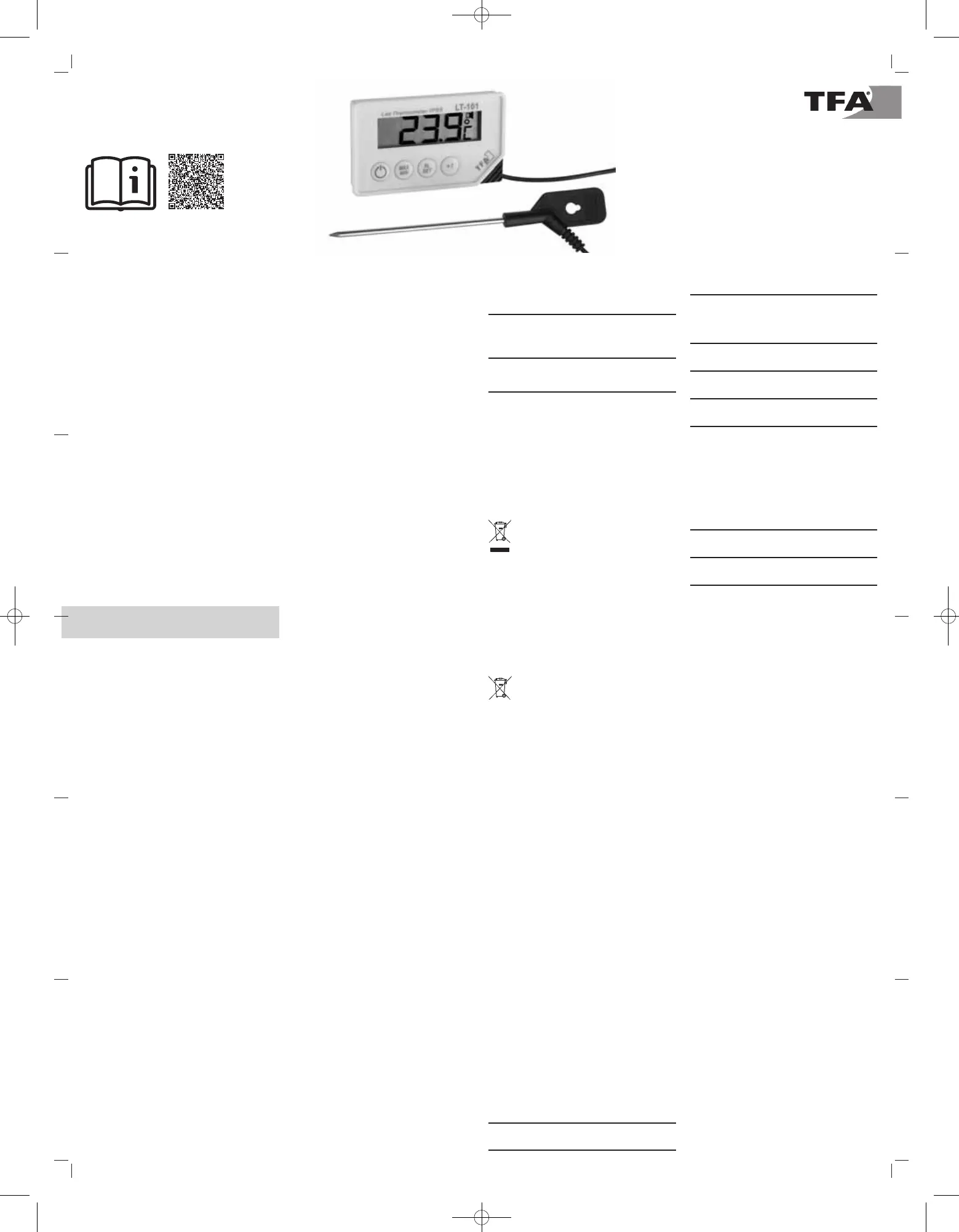 Olvassa el alább 📖 a magyar nyelvű használati útmutatót TFA LT-101 30.1033 (6 oldal) a hőmérő kategóriában. Ezt az útmutatót 13 ember találta hasznosnak és 7 felhasználó értékelte átlagosan 3.9 csillagra