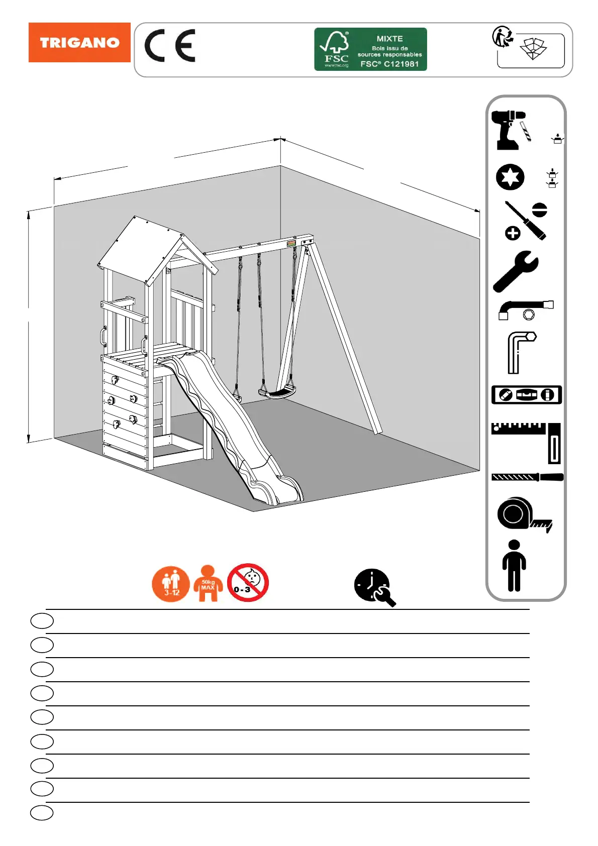 Warning : Risk of falling. This product is for family and outdoor use only. Under the responsibility and supervision of the parents. Structure must be anchored using KIT SECUR'in or concrete.