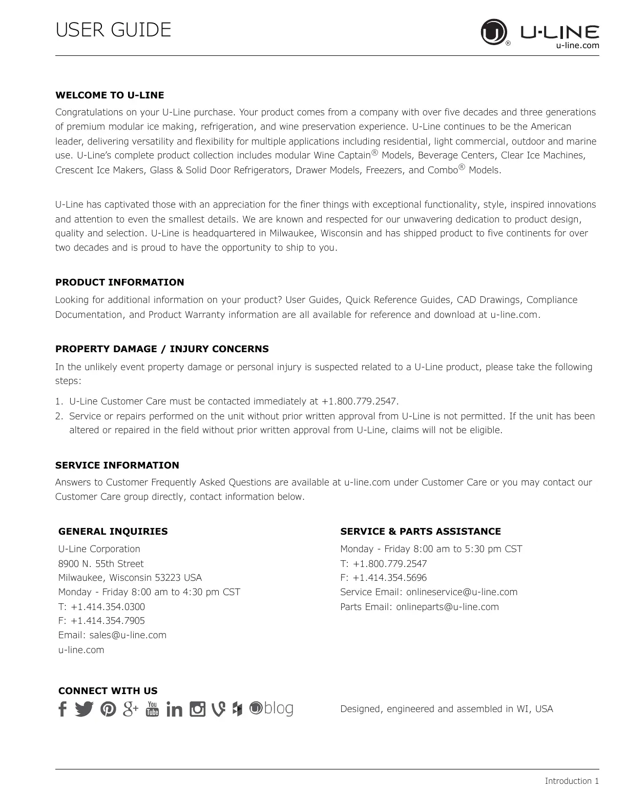 In the unlikely event property damage or personal injury is suspected related to a U-Line product, please take the following