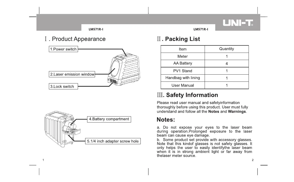 Olvassa el alább 📖 a magyar nyelvű használati útmutatót Uni-T LM571R-I (7 oldal) a lézeres mutató kategóriában. Ezt az útmutatót 16 ember találta hasznosnak és 8.5 felhasználó értékelte átlagosan 4.6 csillagra