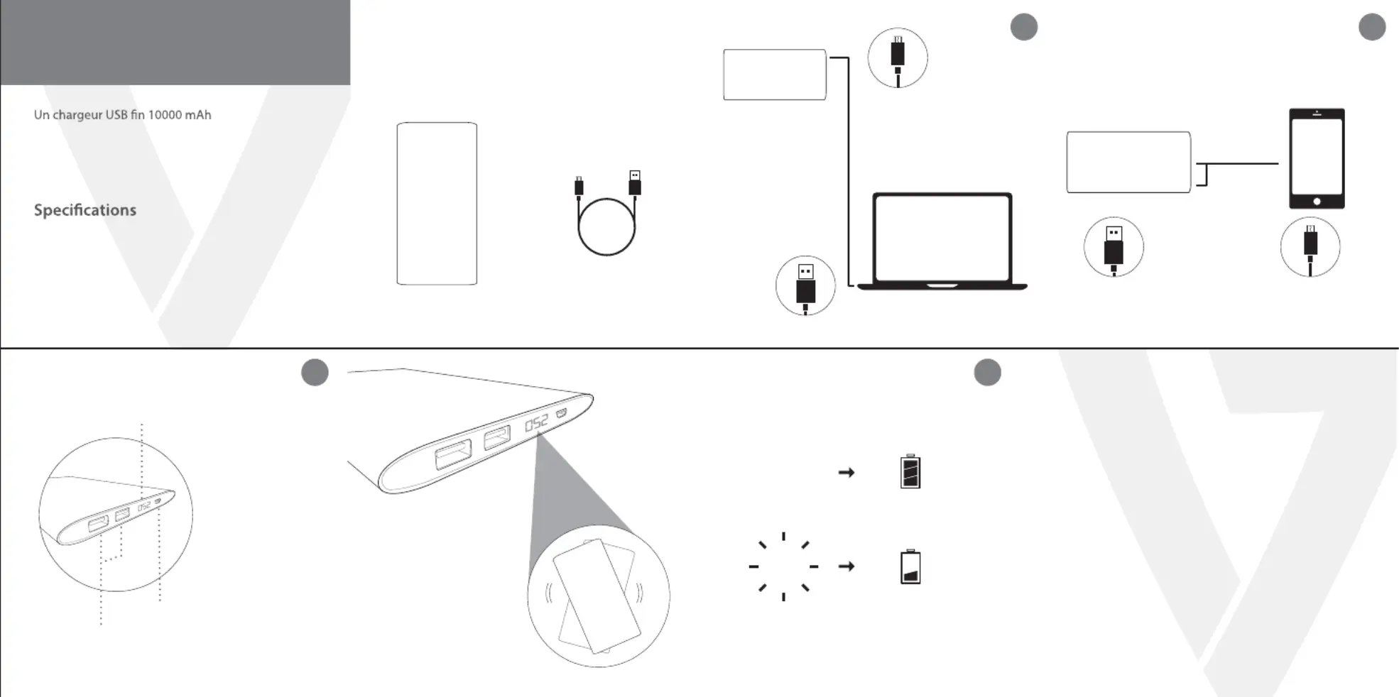 Olvassa el alább 📖 a magyar nyelvű használati útmutatót V7 PB10000P-4NS (1 oldal) a power bank kategóriában. Ezt az útmutatót 14 ember találta hasznosnak és 7.5 felhasználó értékelte átlagosan 4.4 csillagra