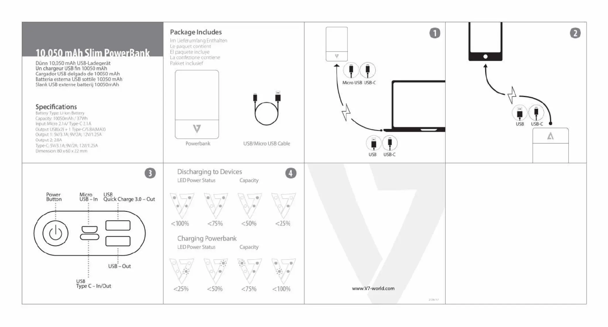 Olvassa el alább 📖 a magyar nyelvű használati útmutatót V7 PBLC10-4N (1 oldal) a power bank kategóriában. Ezt az útmutatót 9 ember találta hasznosnak és 5 felhasználó értékelte átlagosan 4.8 csillagra