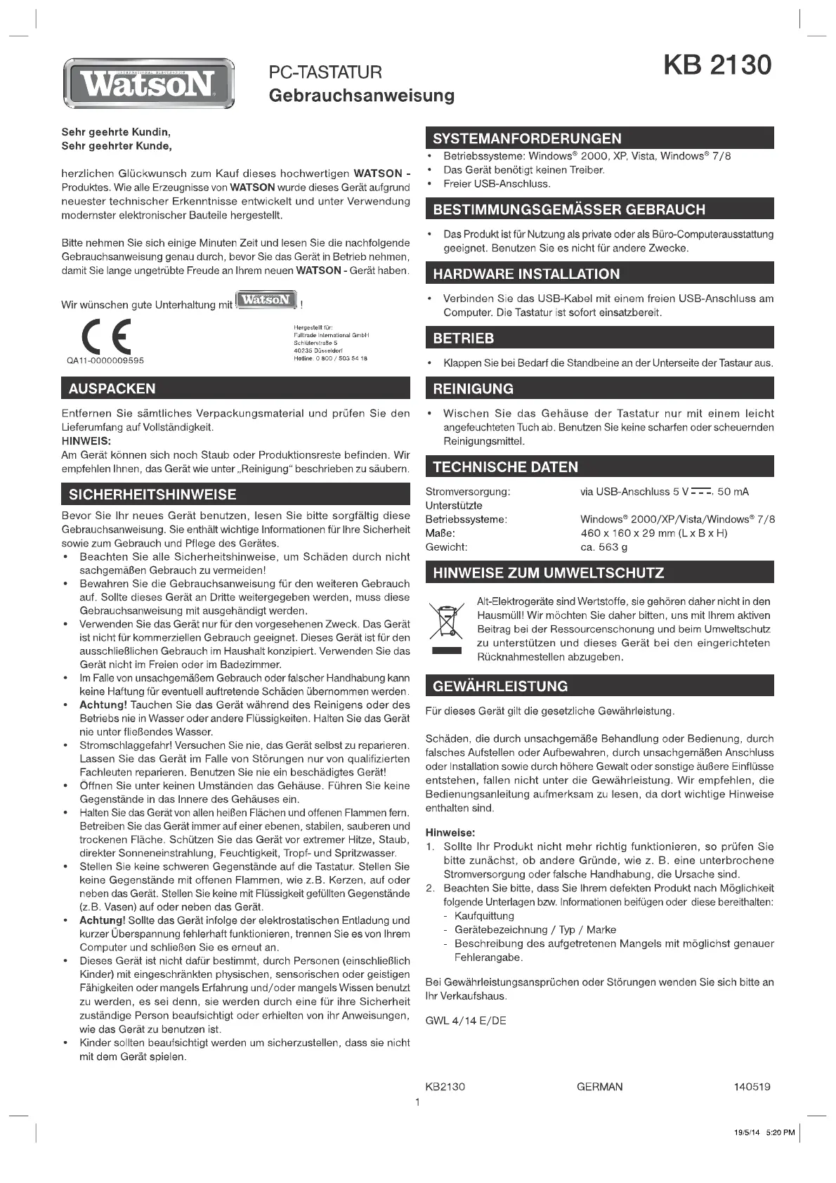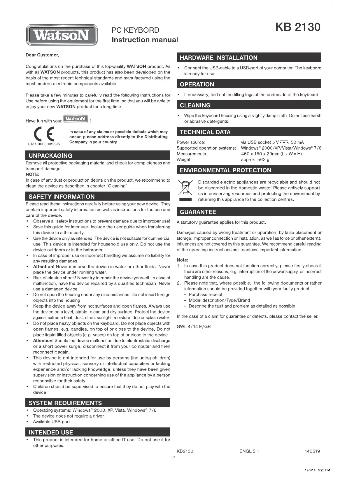 Olvassa el alább 📖 a magyar nyelvű használati útmutatót Watson KB 2130 (2 oldal) a billentyűzet kategóriában. Ezt az útmutatót 10 ember találta hasznosnak és 5.5 felhasználó értékelte átlagosan 4.4 csillagra